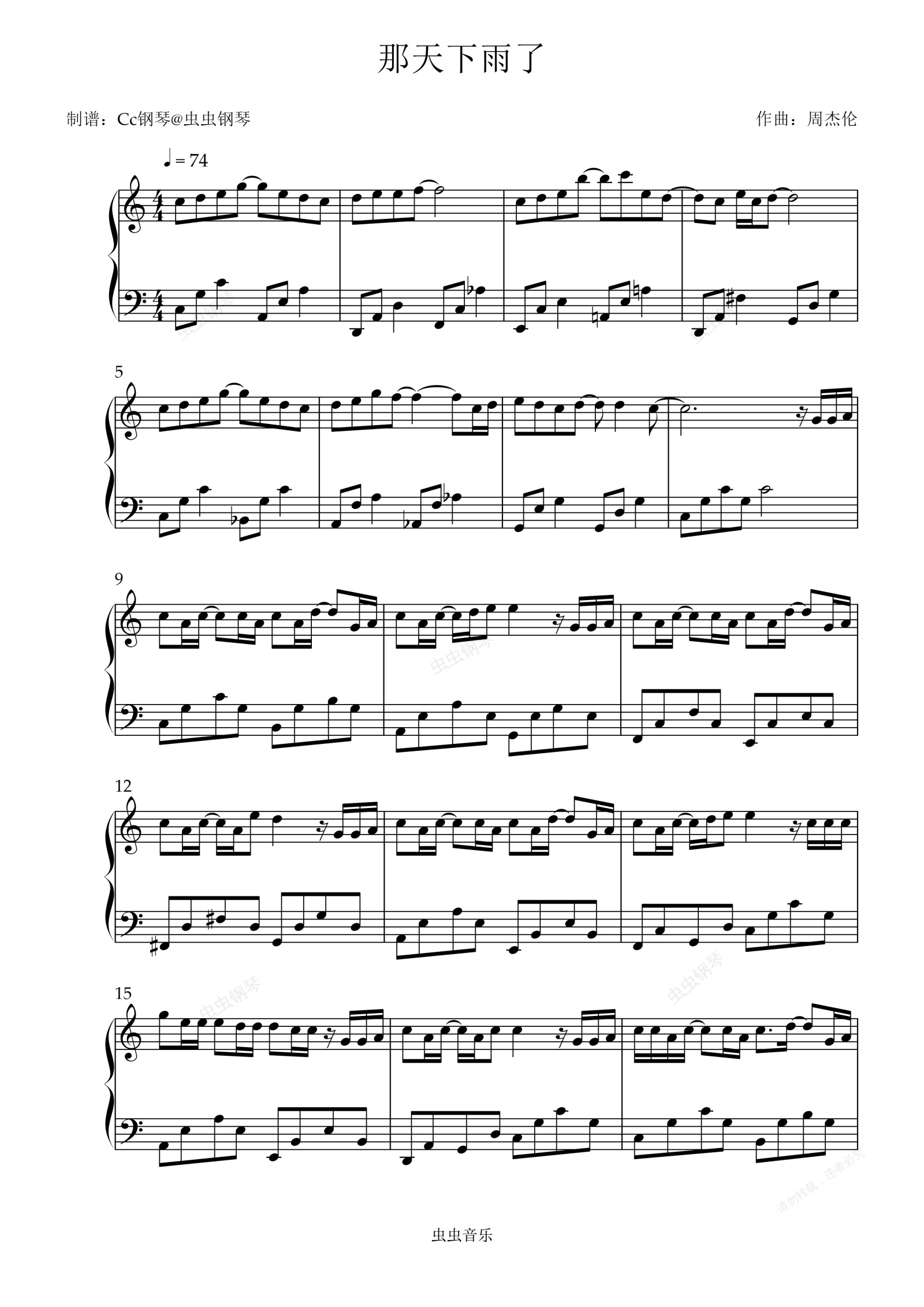 钢琴谱:那天下雨了 C调 好听易上手