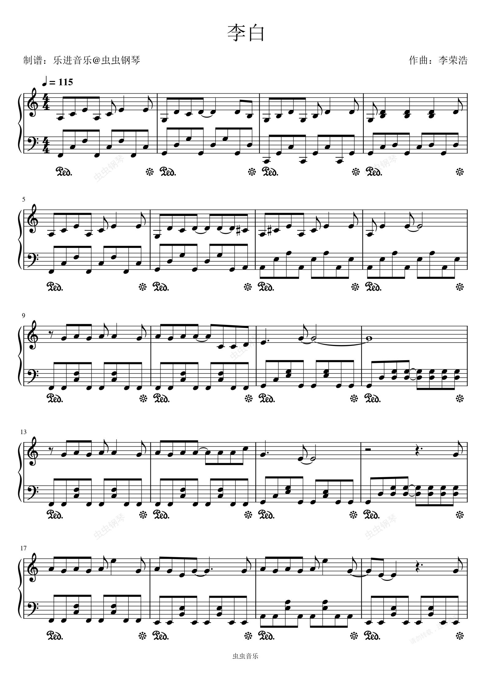钢琴谱:《李白》李荣浩C调