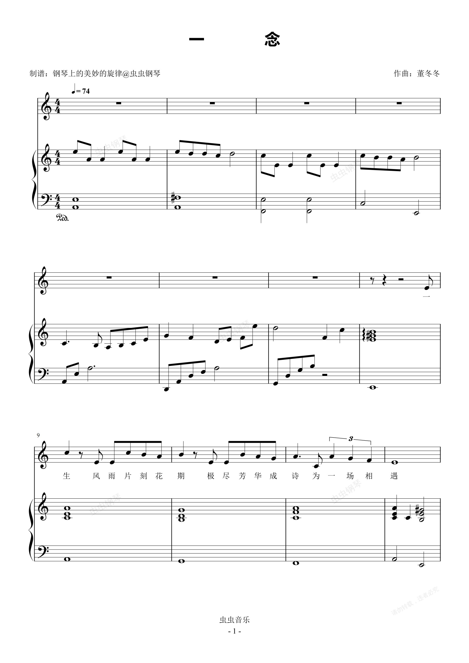 钢琴谱:一念 C调简易钢琴弹唱伴奏 带歌词 张紫宁/李鑫 逐玉