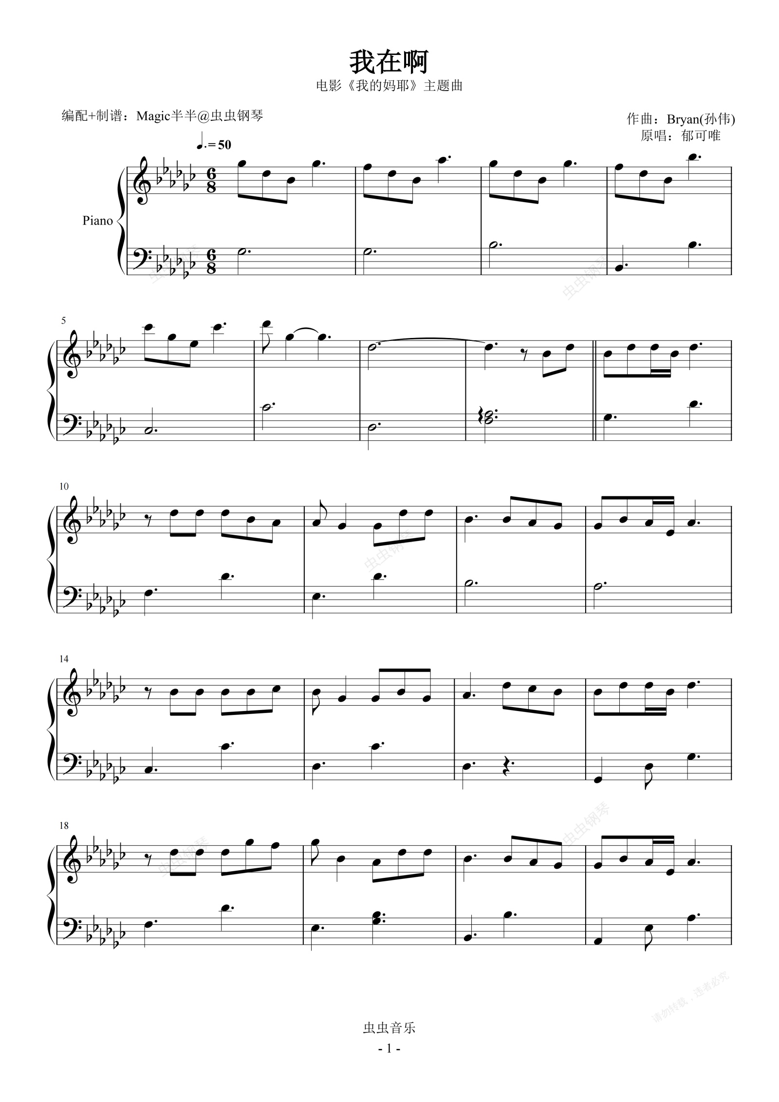 钢琴谱:我在啊(适幼版/简易/降G) <我的妈耶>电影主题曲