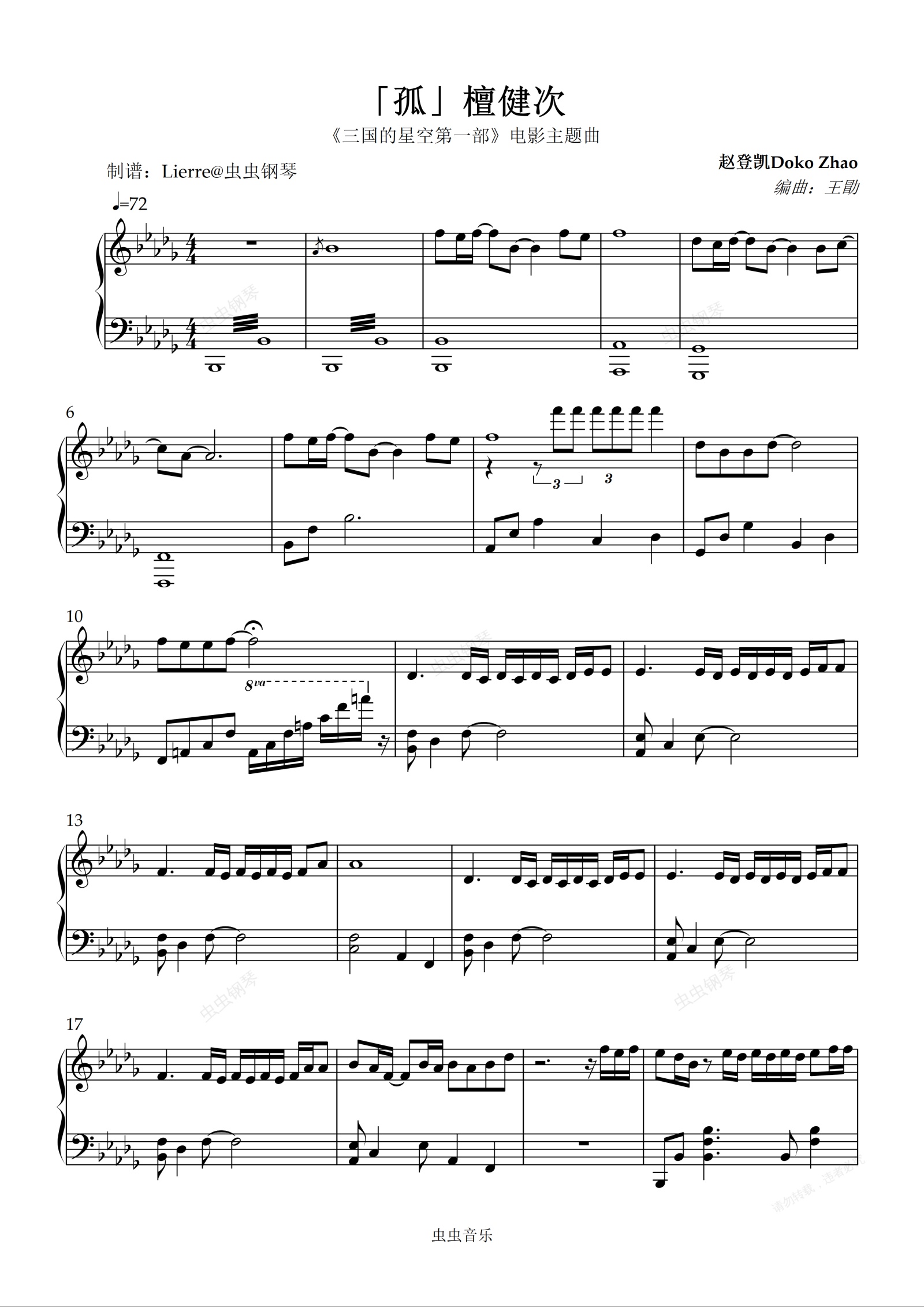 钢琴谱:「孤」《三国的星空第一部》电影主题曲 檀健次