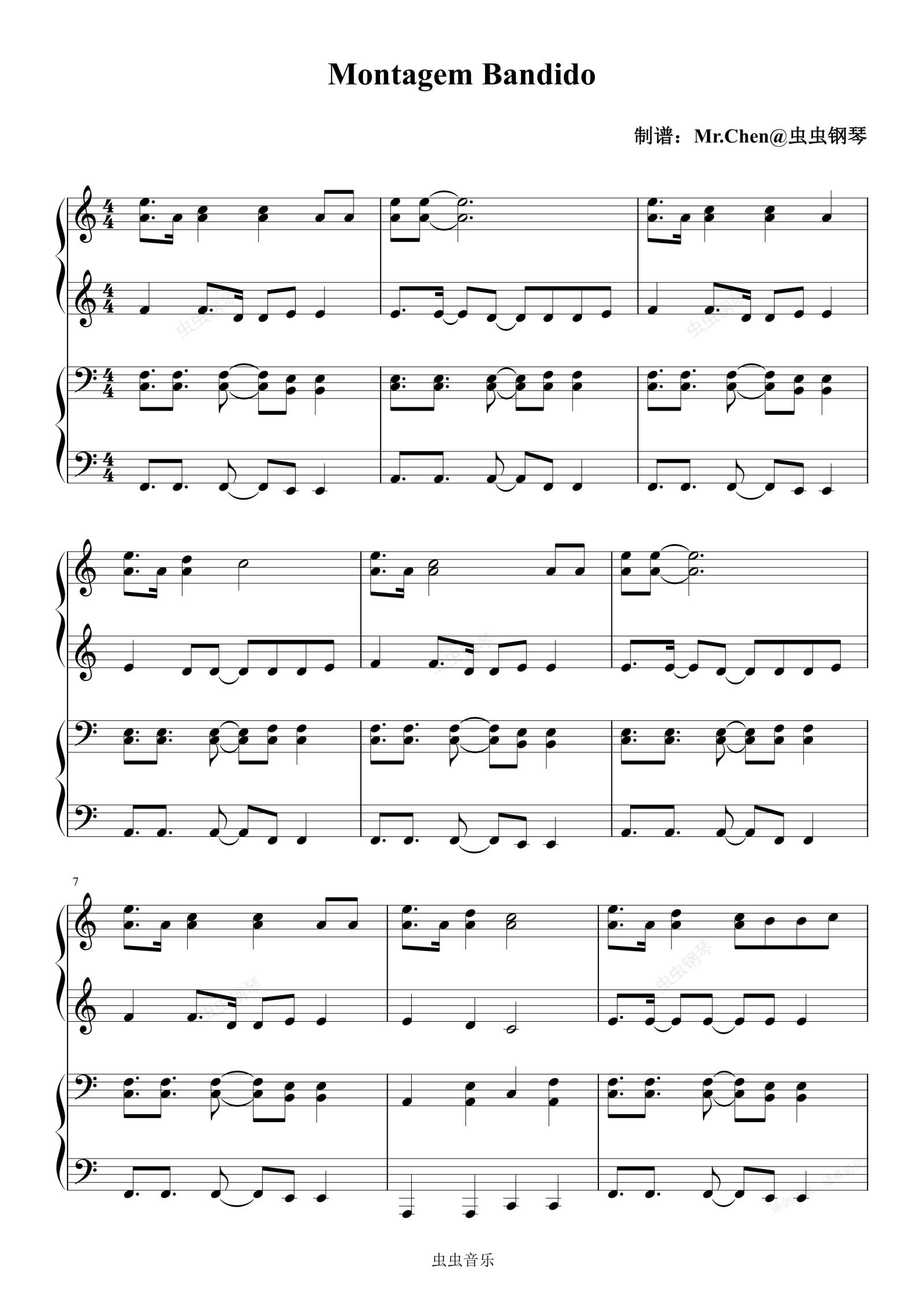 钢琴谱:Montagem Bandido (四手联弹)C调 - 巴西Funk