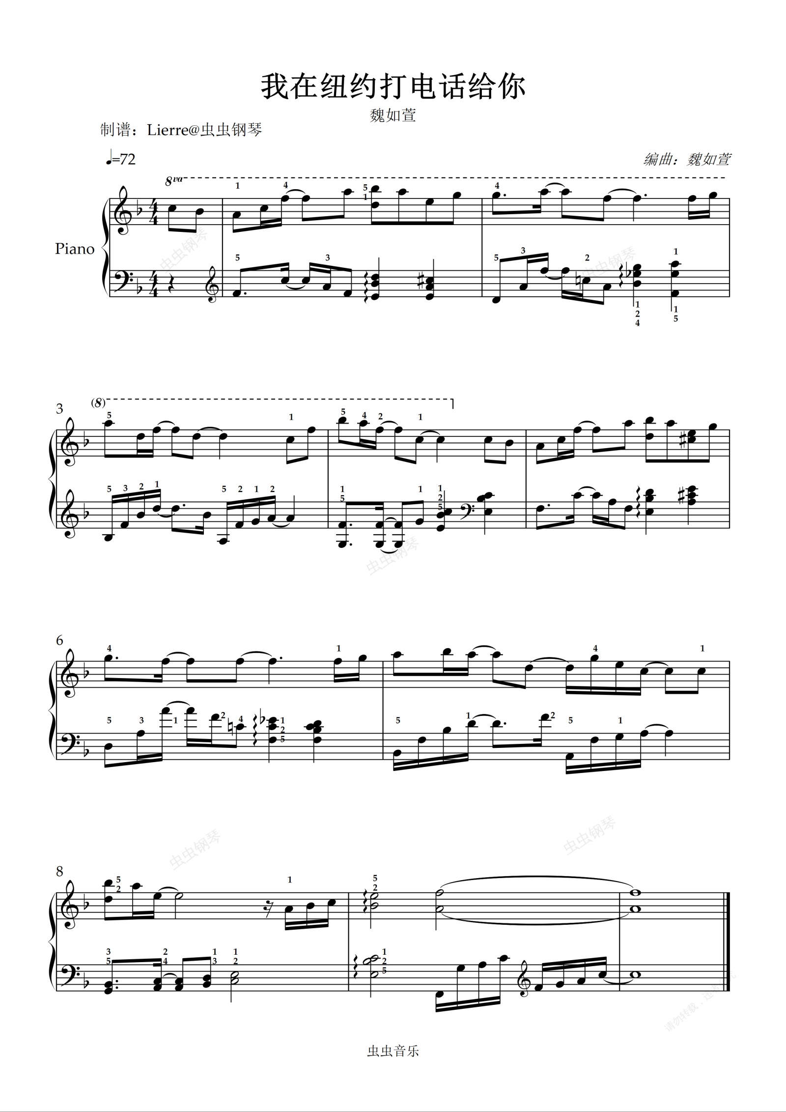 钢琴谱:「我在纽约打电话给你」原调好听版 魏如萱