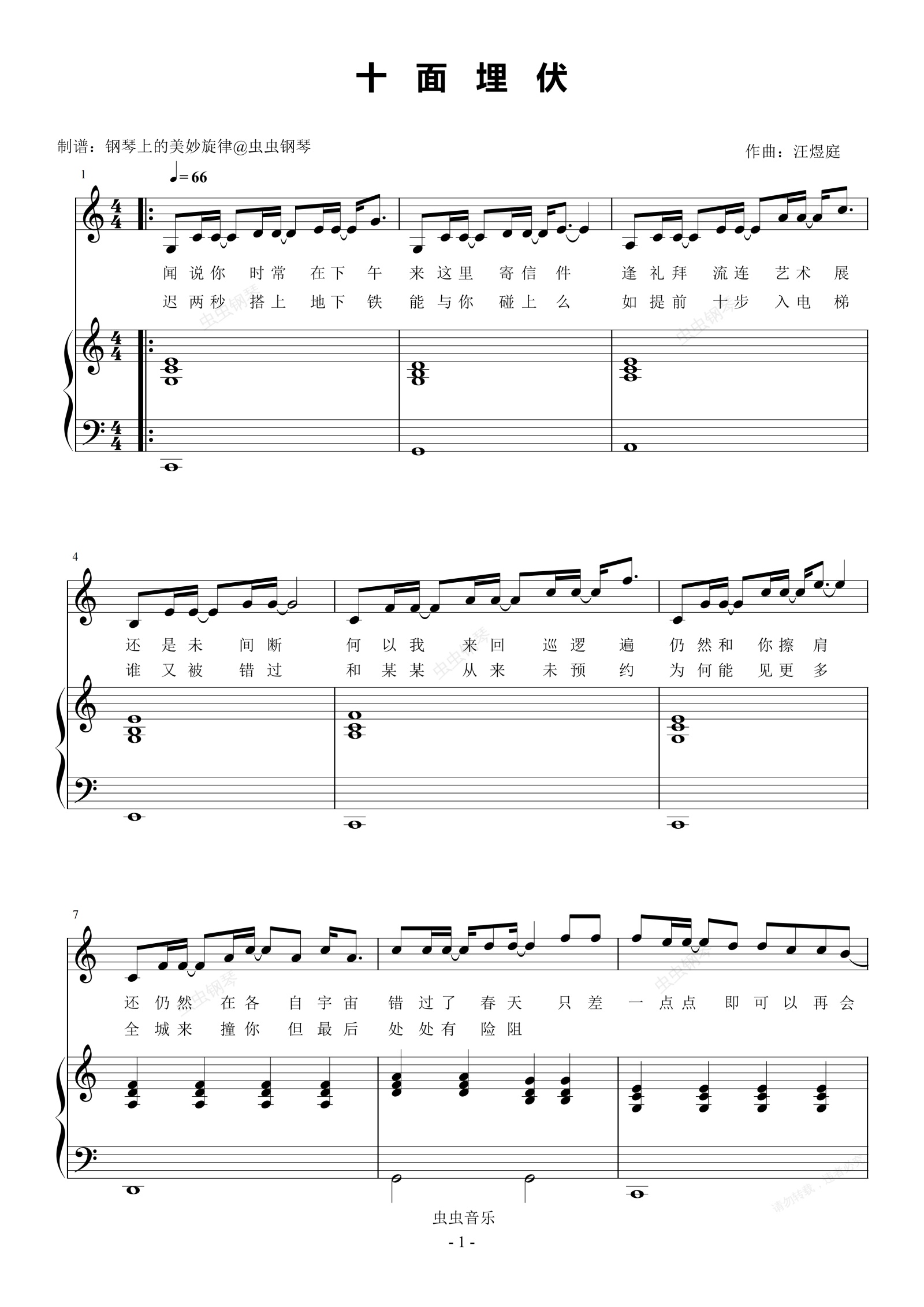 钢琴谱:十面埋伏 C调简易钢琴弹唱伴奏 带歌词 陈奕迅
