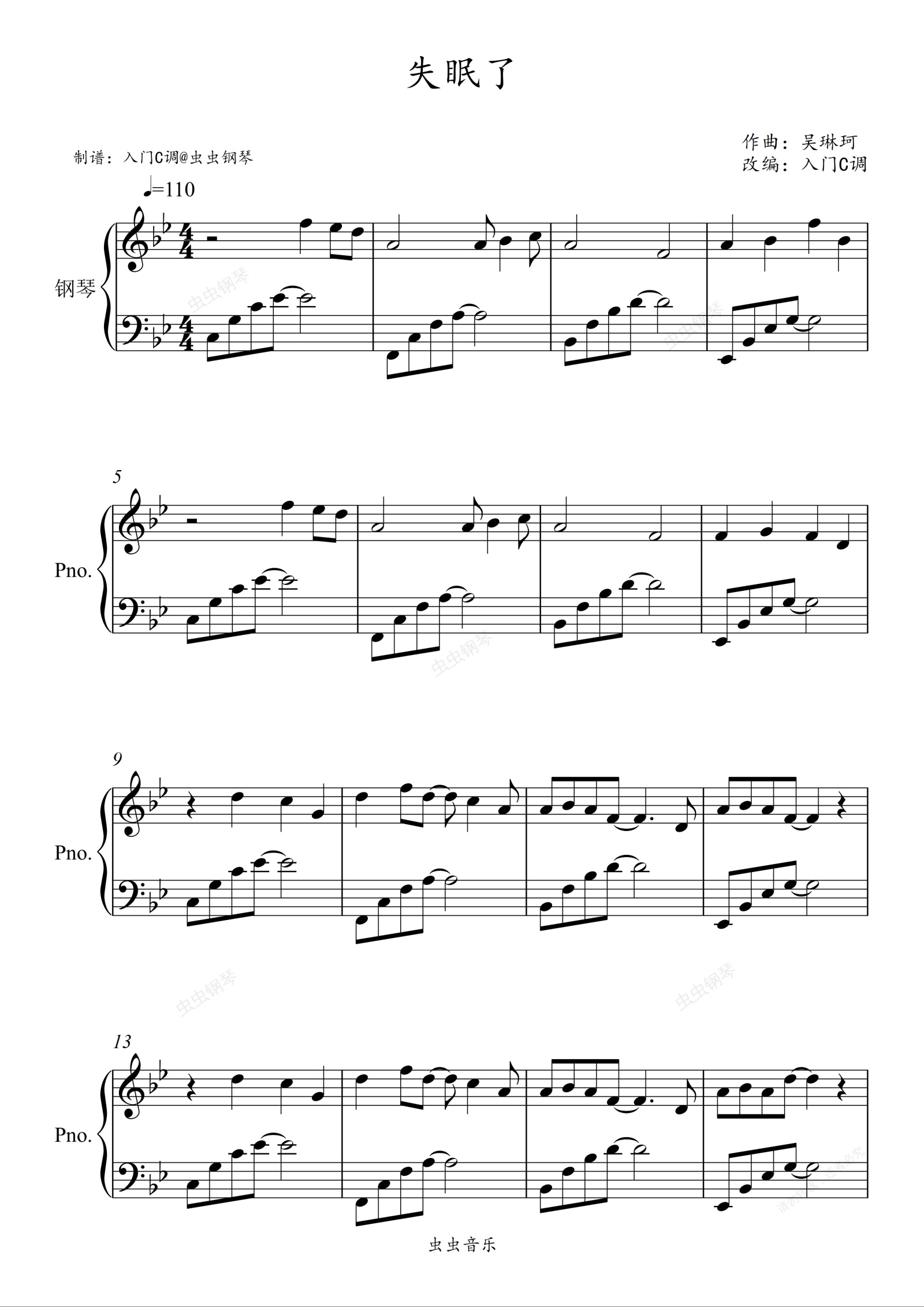 钢琴谱:失眠了 - 吴琳珂【原调简单入门版】
