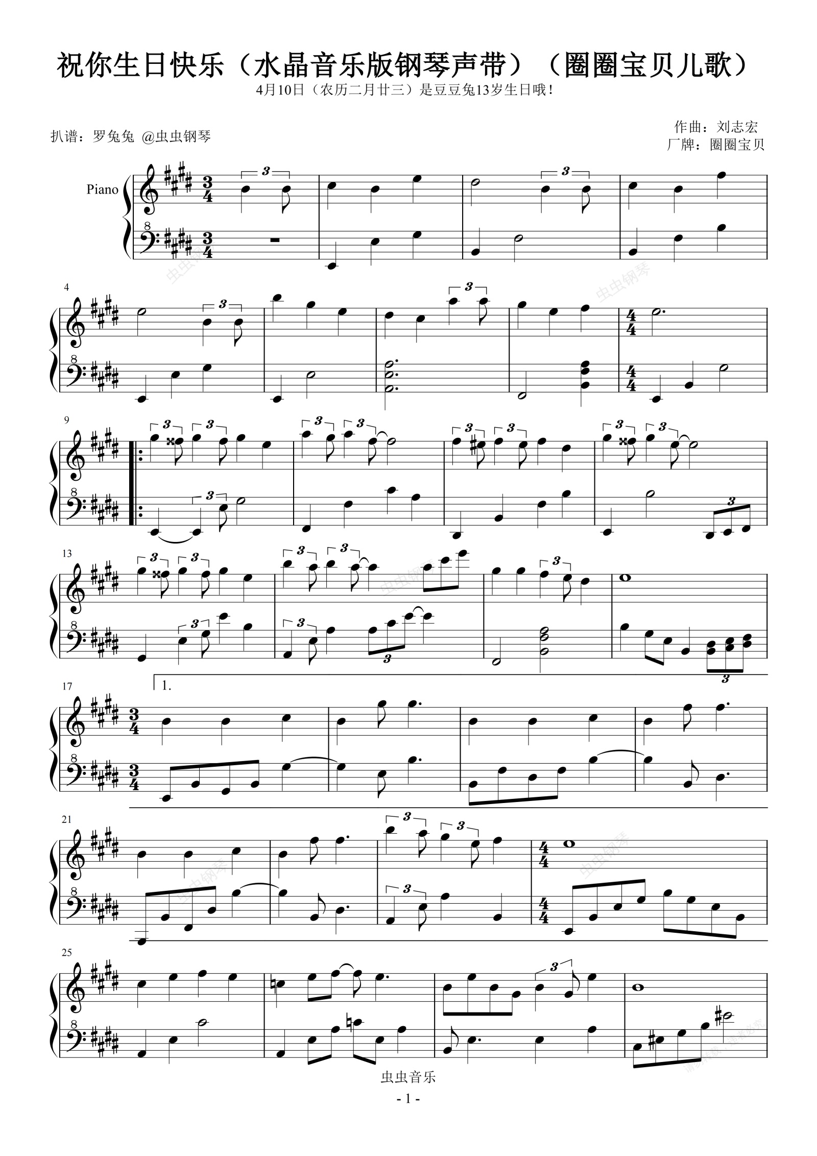钢琴谱:祝你生日快乐(水晶音乐版钢琴声带)(圈圈宝贝儿歌)(祝豆豆兔13岁生日快乐!)