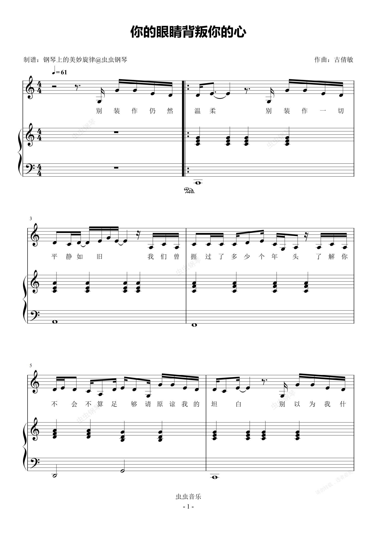 钢琴谱:你的眼睛背叛你的心 C调简易钢琴弹唱伴奏 带歌词 郑中基 流行经典