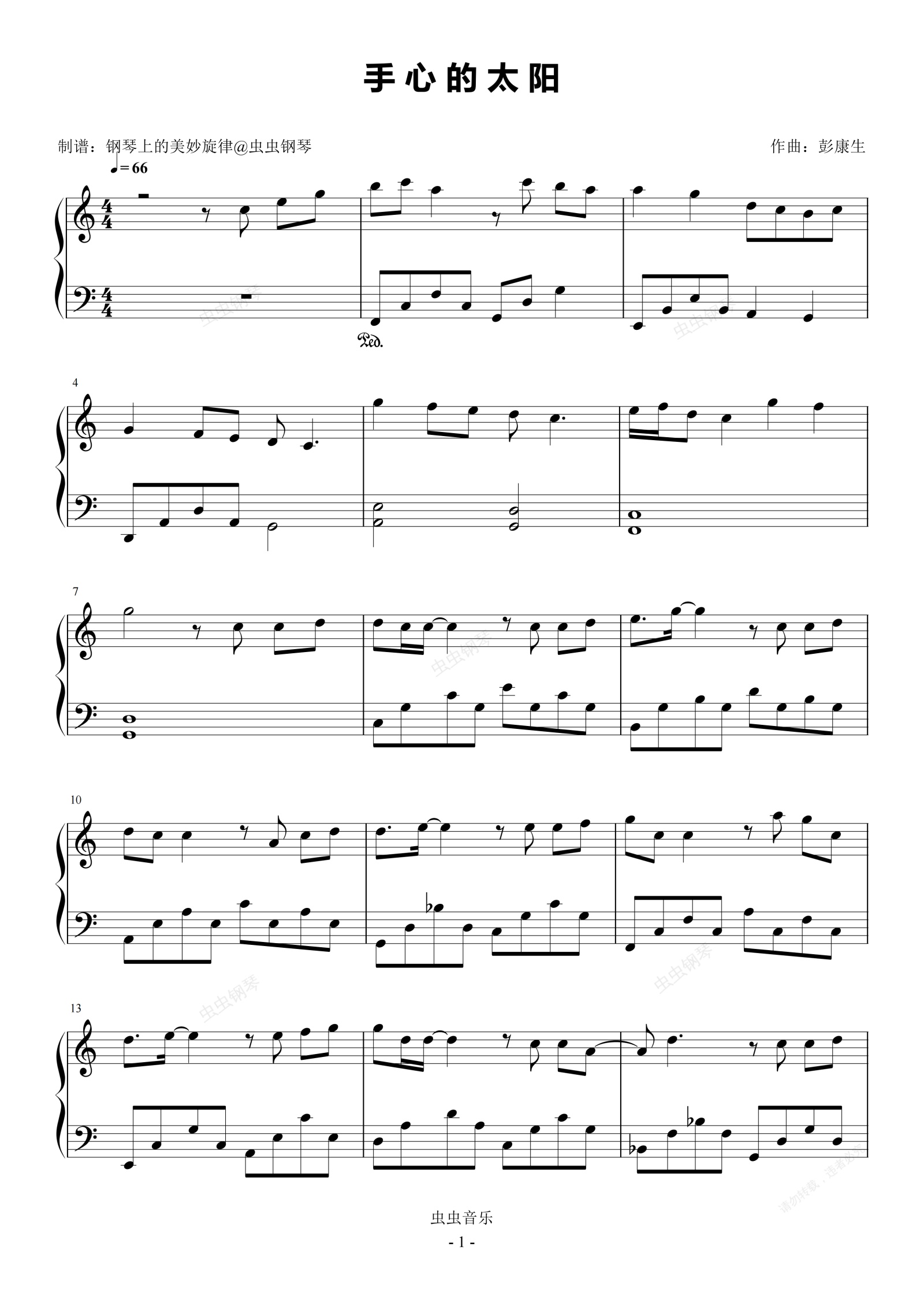 钢琴谱:手心的太阳 C调简易版 张韶涵 流行经典