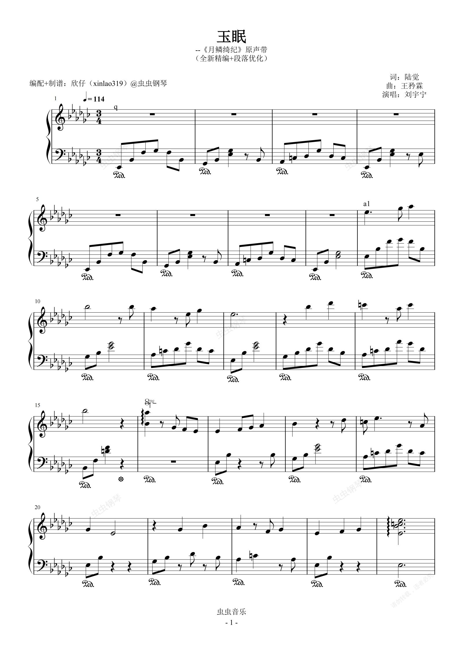 钢琴谱:玉眠(原调降G、刘宇宁《月鳞绮纪》原声带、段落优化)