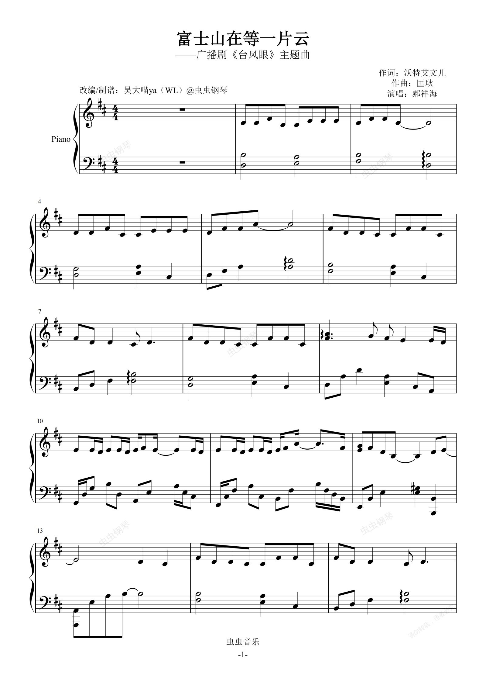 钢琴谱:富士山在等一片云-广播剧《台风眼》主题曲 原调