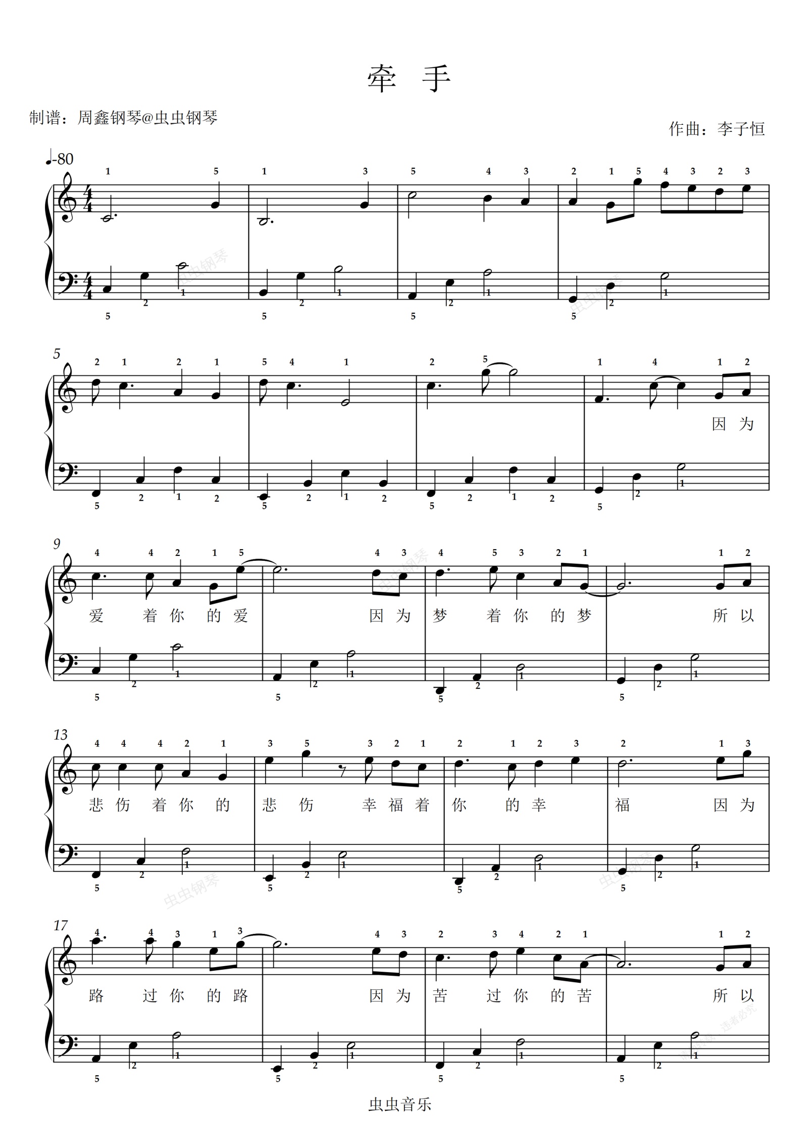 钢琴谱:《牵手》苏芮 C调 带歌词 带指法 简单版
