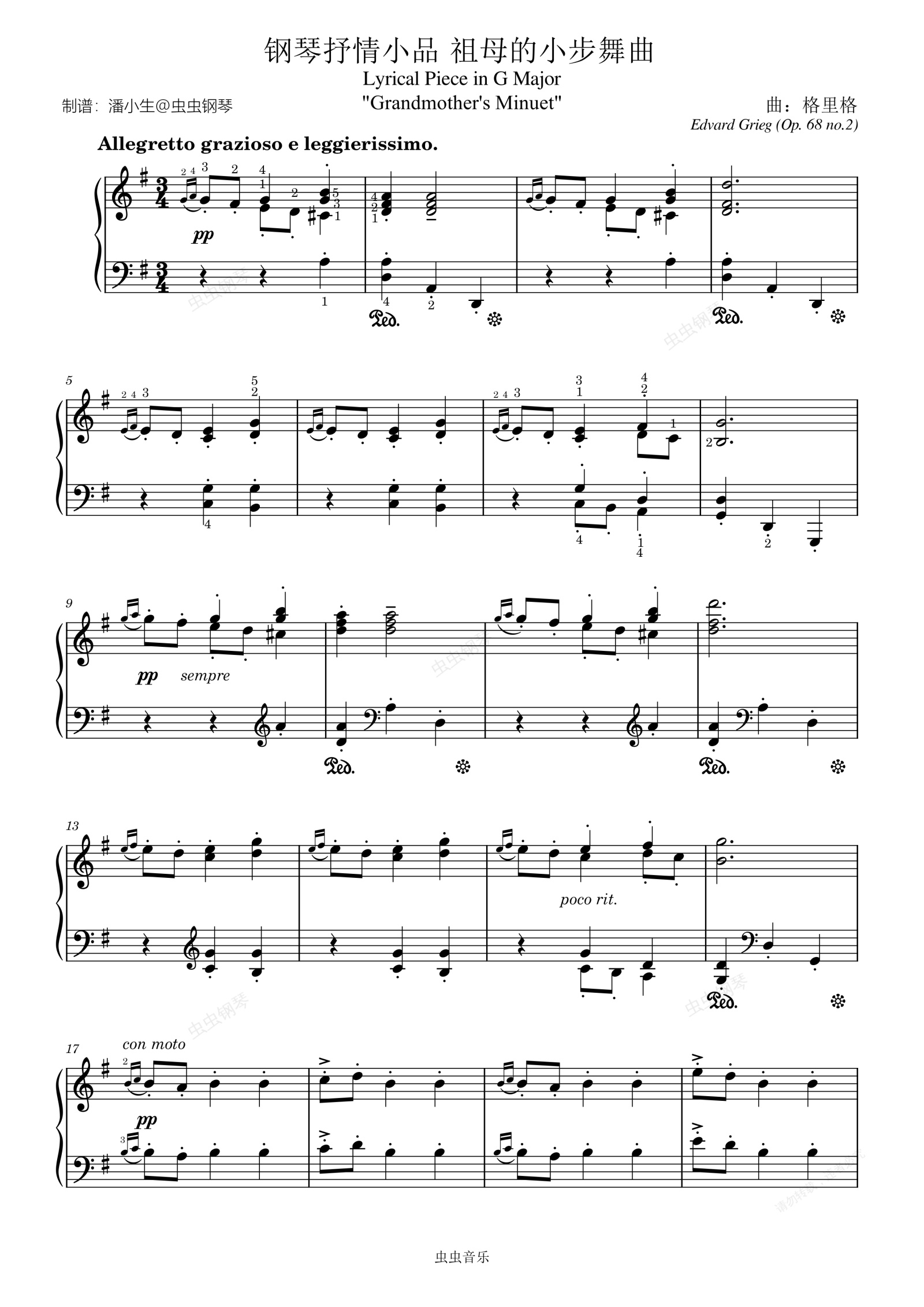 格里格 钢琴抒情小品 祖母的小步舞曲 Op.68 No.2, Grandmother's Minuet 原版带指法 钢琴独奏谱