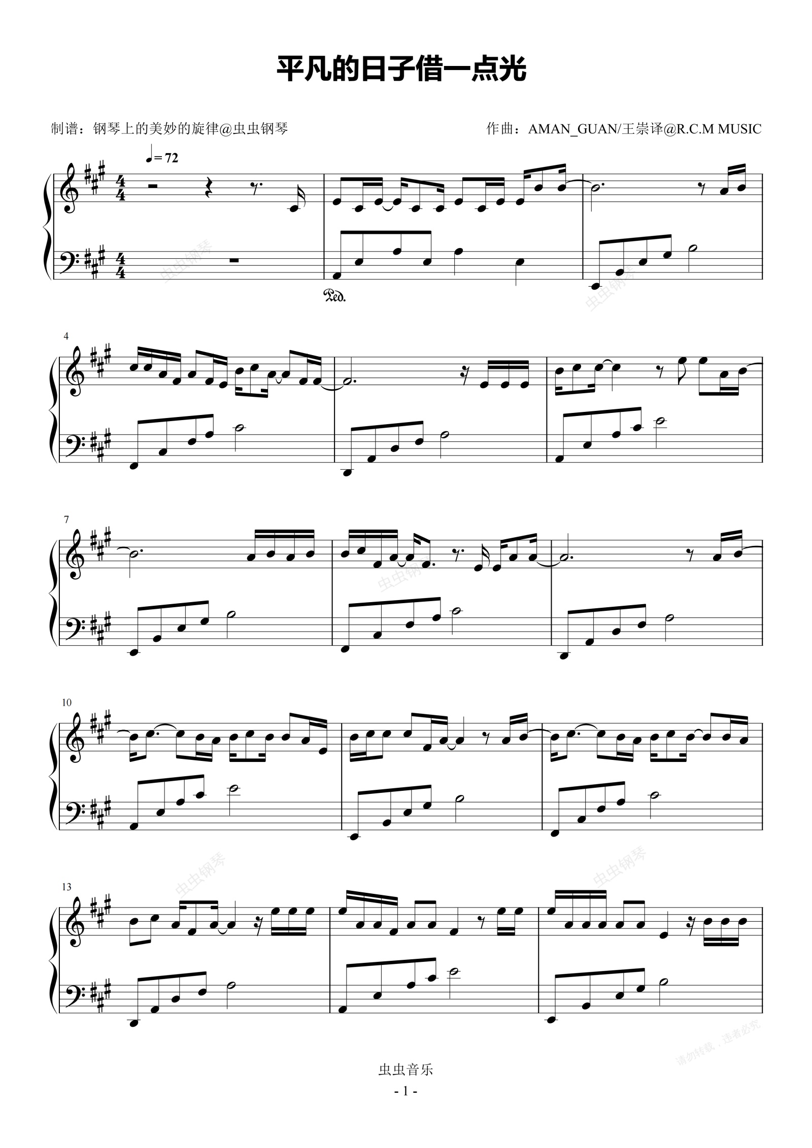 钢琴谱:平凡的日子借一点光 原调简易版 刘宇宁