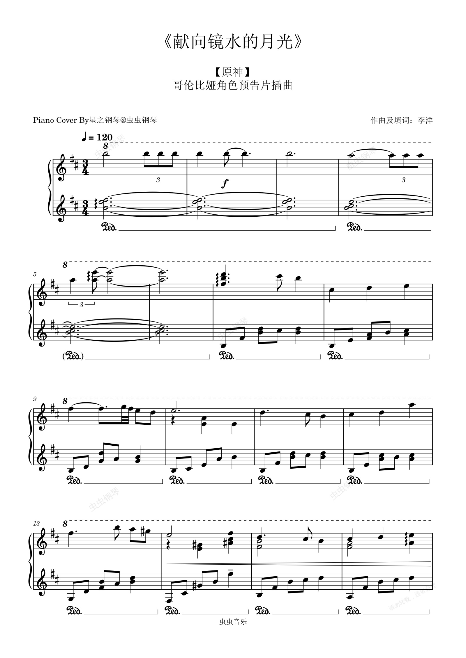 钢琴谱:【原神】哥伦比亚预告曲《献向镜水的月光》还原钢琴谱~星之钢琴~