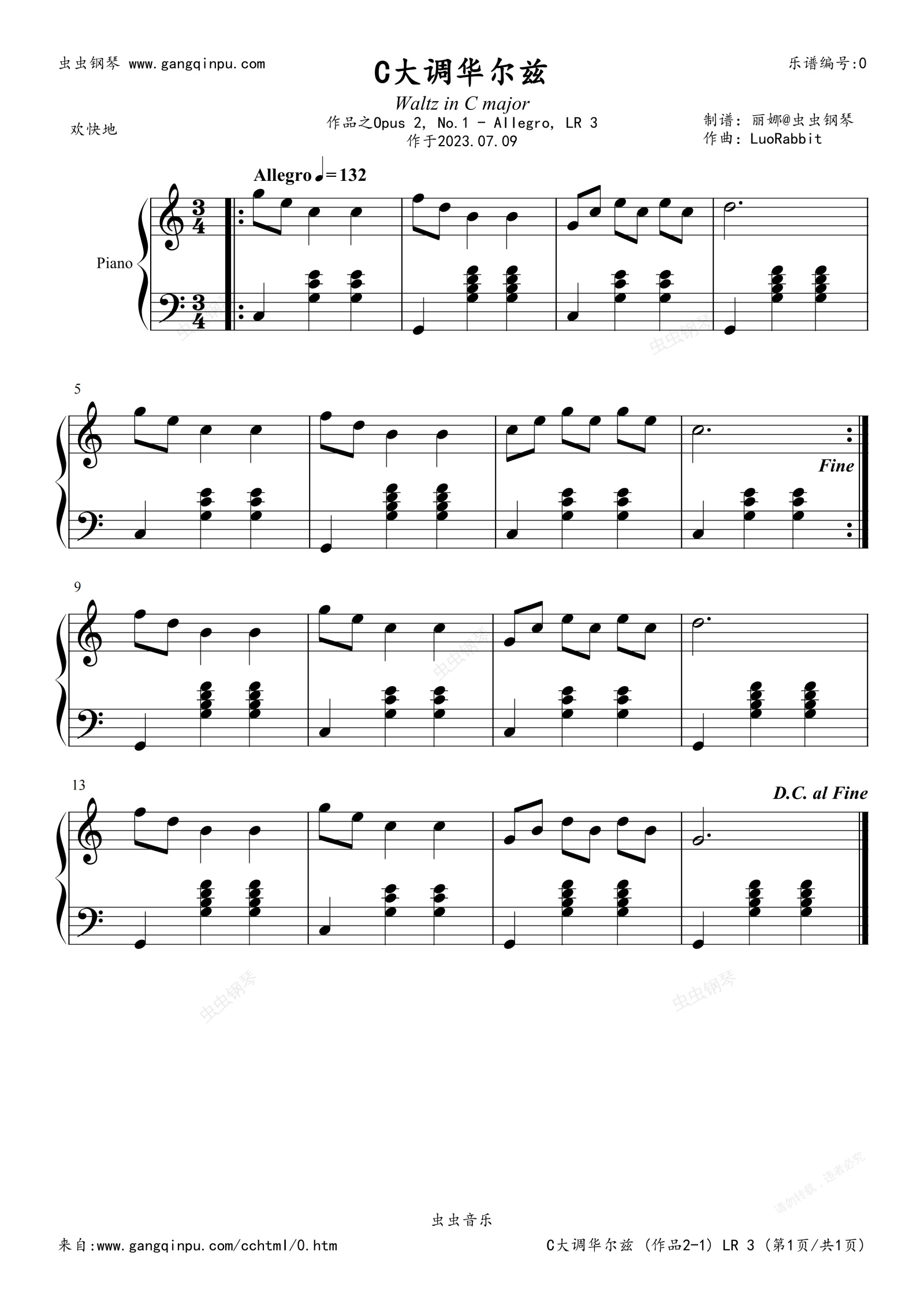 摘录自“罗兔兔”的专辑《Waltz in C major, Opus 2》第一首,Waltz in C major, Opus 2, No. 1 -, LR 3 (C大调华尔兹,作品2-1,快板,LR 3),作于2023年07月09日,并于同年发行,罗兔兔原创古典音乐。
