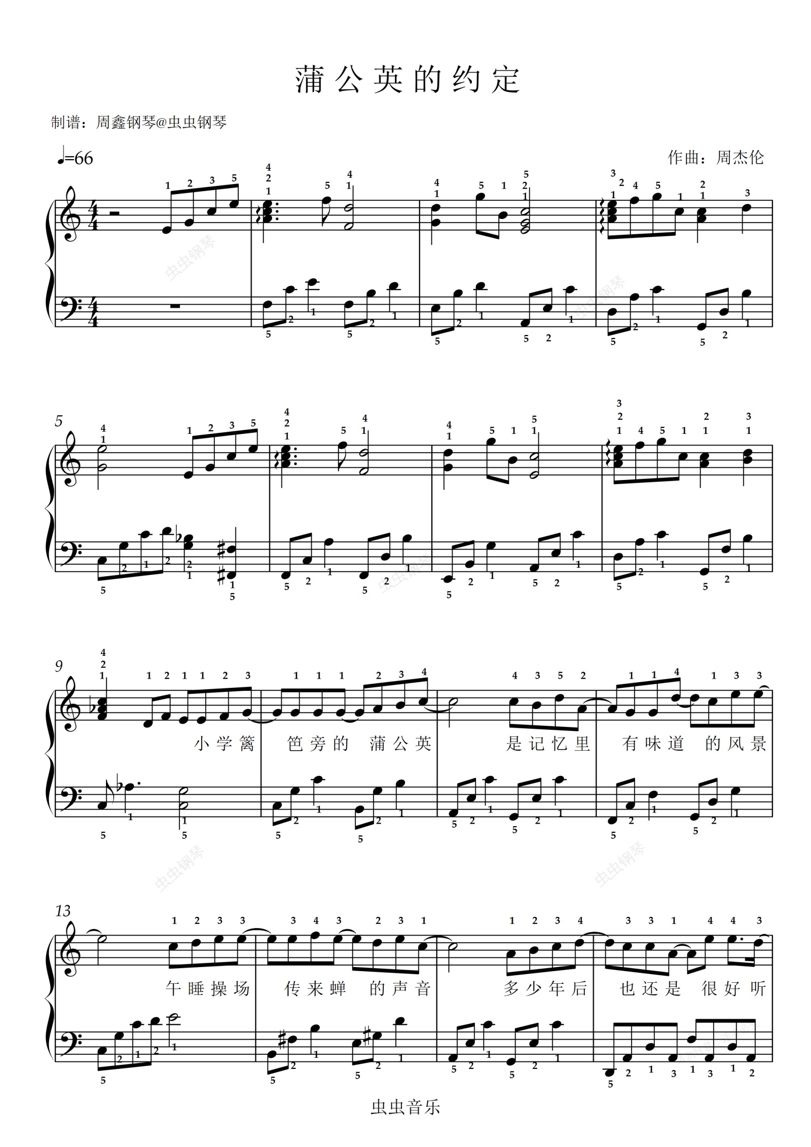 钢琴谱:《蒲公英的约定》C调 带歌词 带指法 简单版
