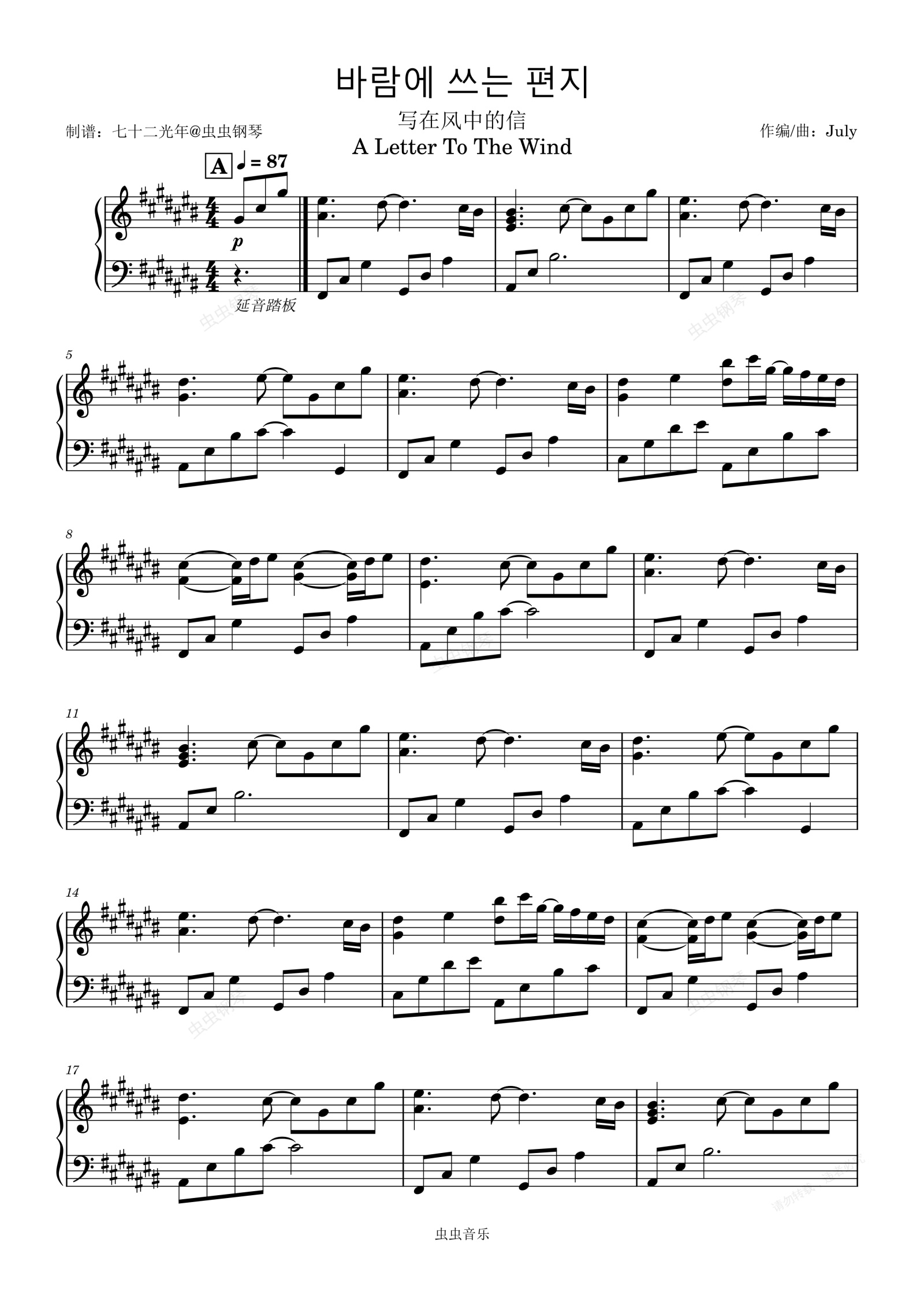 钢琴谱:바람에 쓰는 편지 写在风中的信 A Letter To The Wind