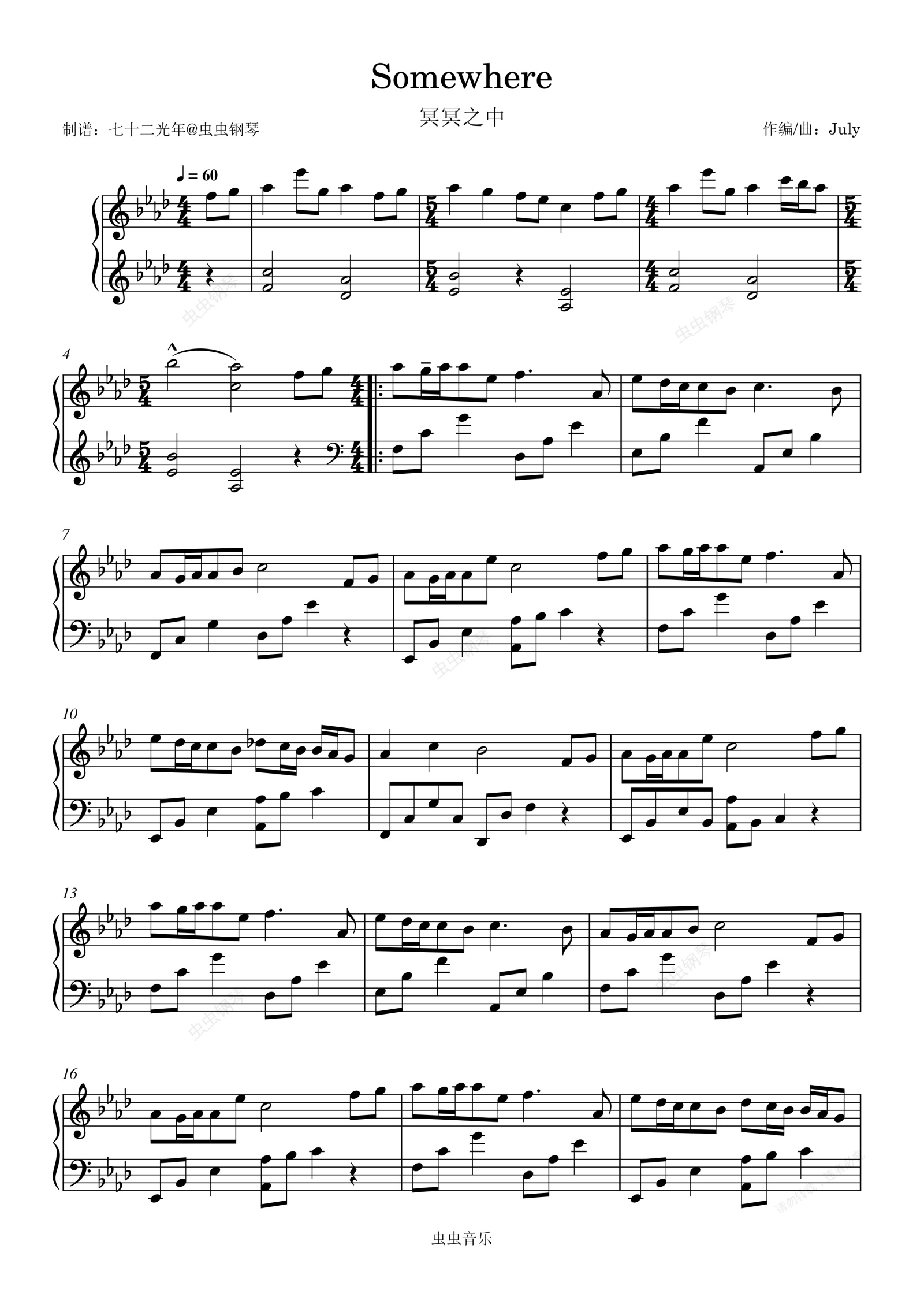 钢琴谱:Somewhere(精编) 冥冥之中
