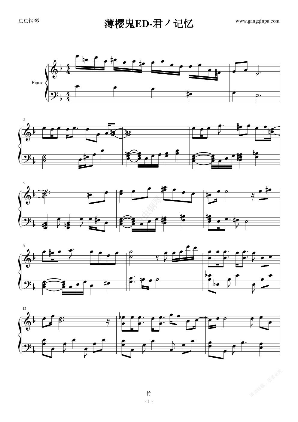 钢琴谱:「薄樱鬼ED」君ノ记忆