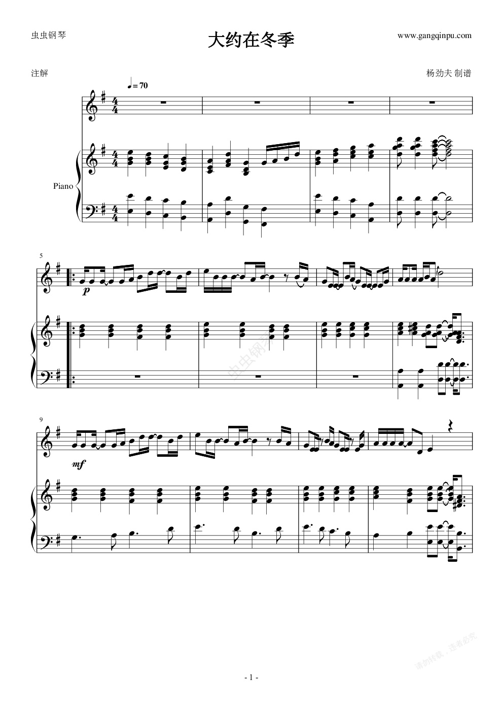 钢琴谱:大约在冬季