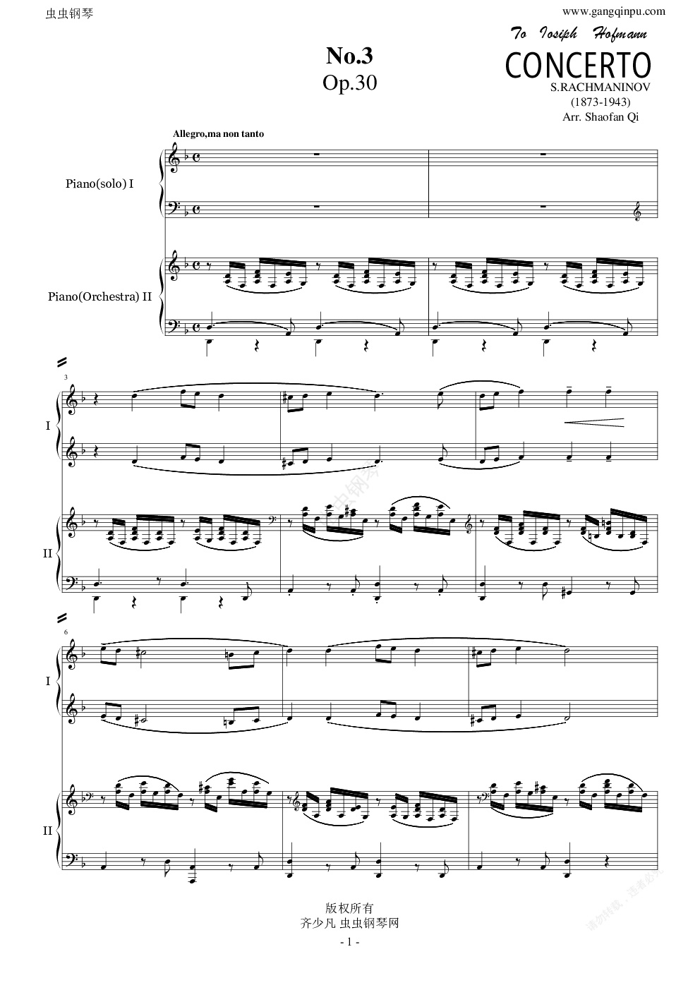 钢琴谱:拉赫玛尼诺夫第三钢琴协奏曲 第一乐章
