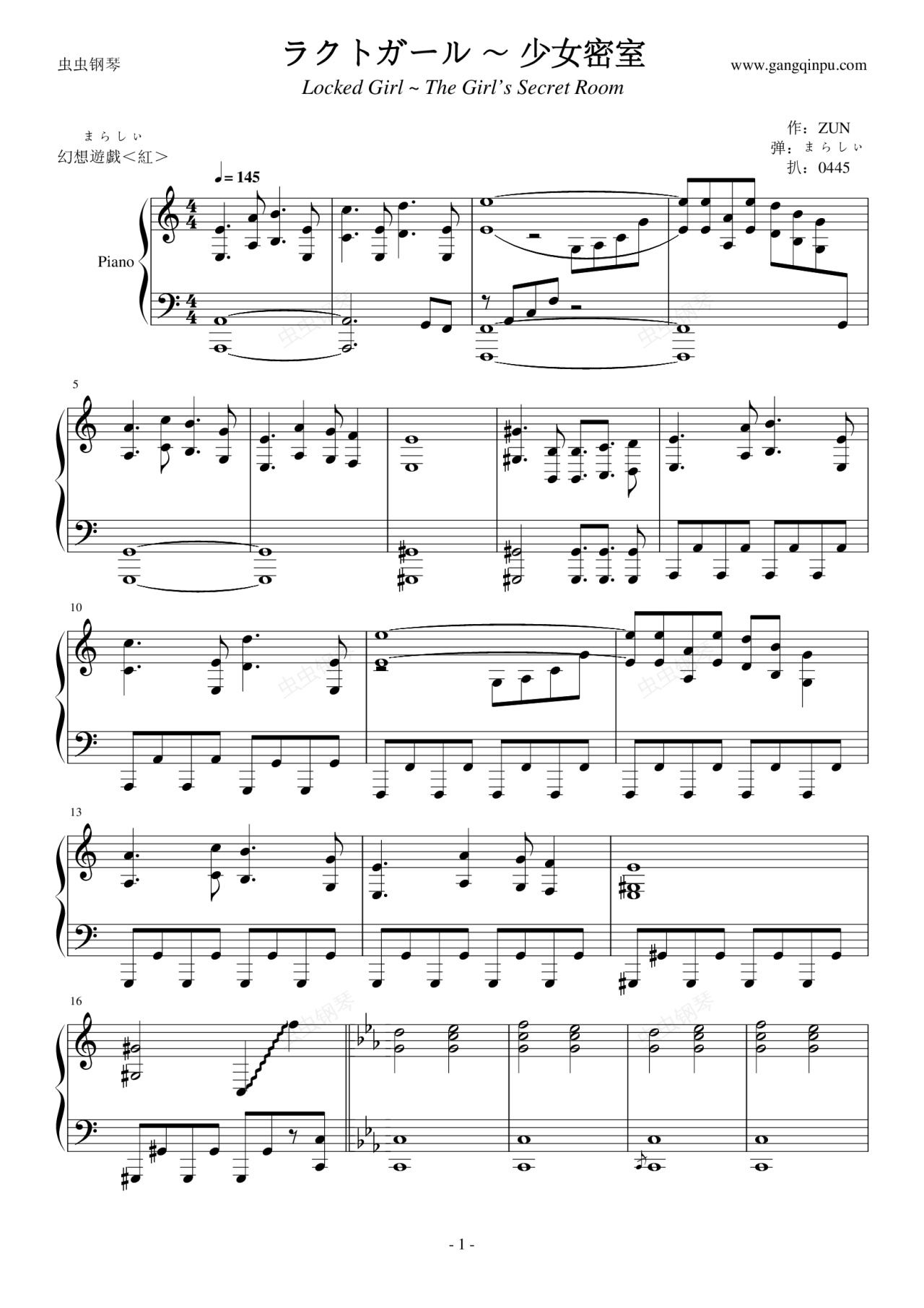 钢琴谱:【东方红魔乡】【触手猴】ラクトガール ~ 少女密室
