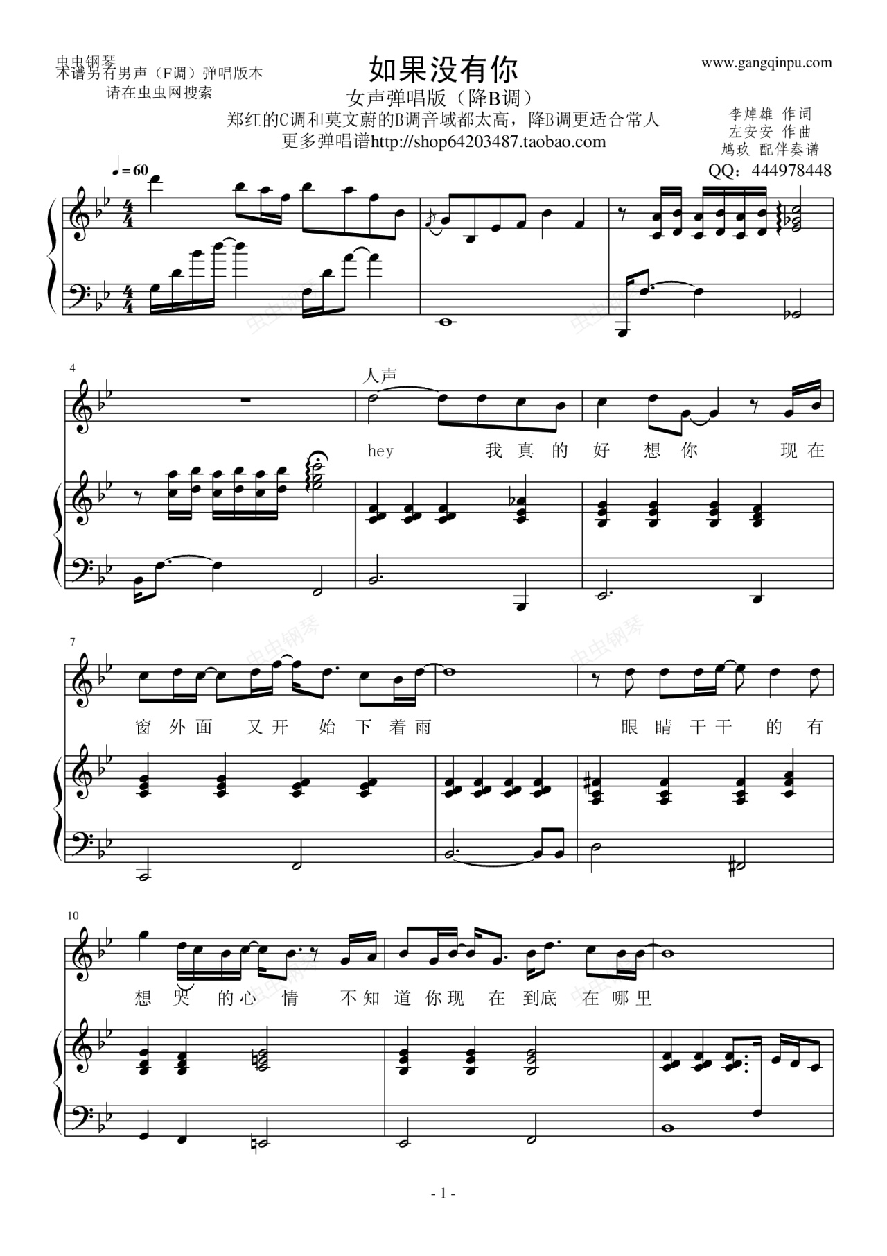钢琴谱:如果没有你女声弹唱版(降B调)