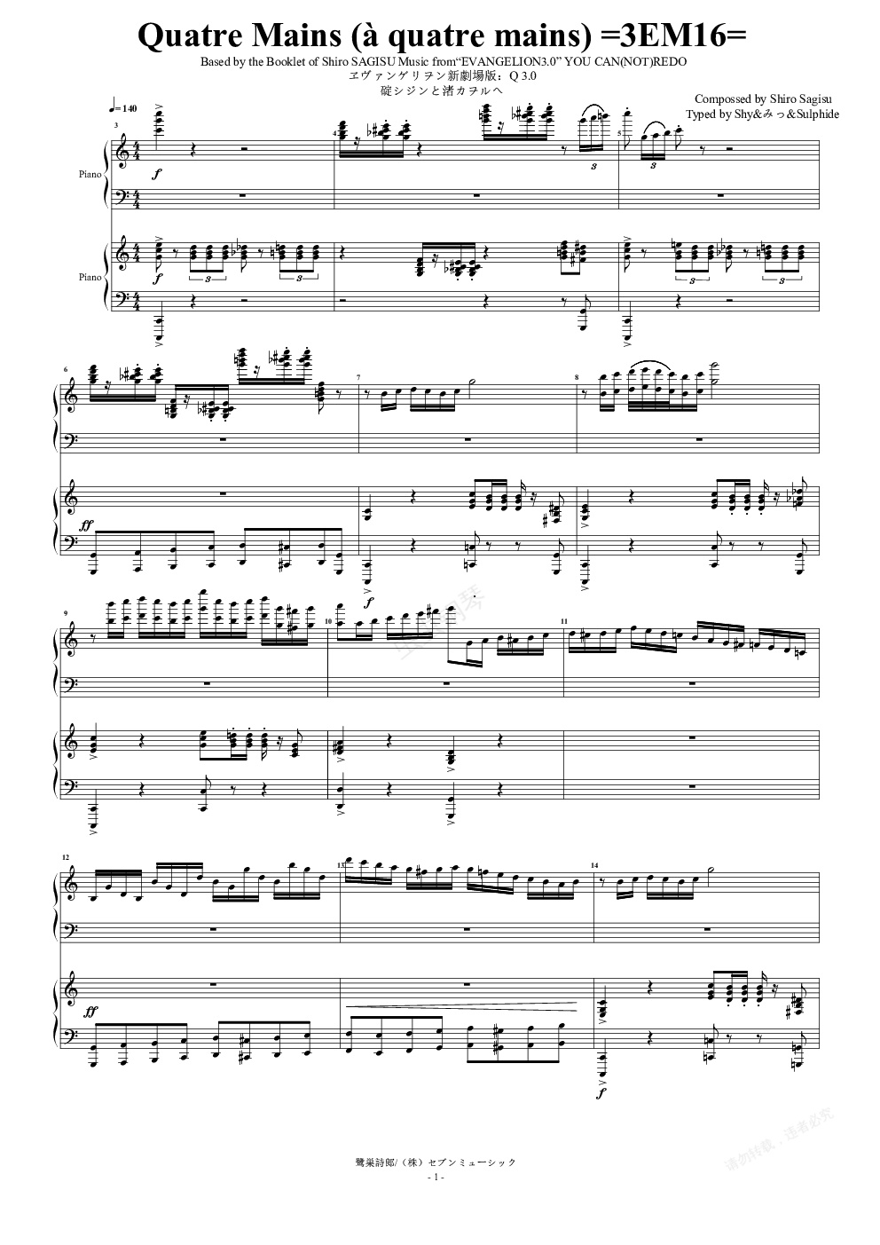 Mains(à mains) =3EM16= EVA新剧场版Q中真嗣和薰的四手联弹的完整版 参照12年11月28日发售的CD中BK附赠的官方谱子完成,未在MIDI音效上做过多调整,主要目的还原的原始谱面效果,方便打印。 如有误差请参照原始BK上的谱子( Piano Forte #1 ~エヴァンゲリオン ピアノフォルテ #1~ オフィシャルミュージックスコアブック相关页面亦可) 本稿为第二稿,主要由SHY完成 第一稿(已废),由及みっ完成 谱面速度标记参照原作者鹭巢诗郎官网说明 补充修正说明:修正第4页第43小节低声部右手部分错误,完善谱面相关备注信息