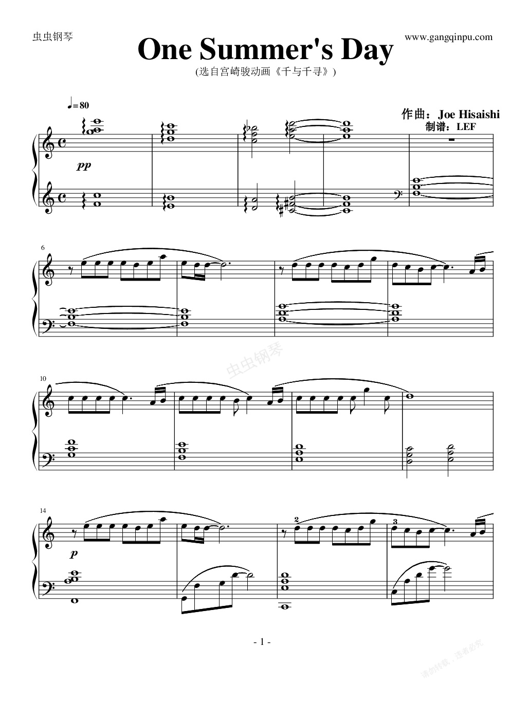钢琴谱:One SummerDay(选自电影《千与千寻》)带指法