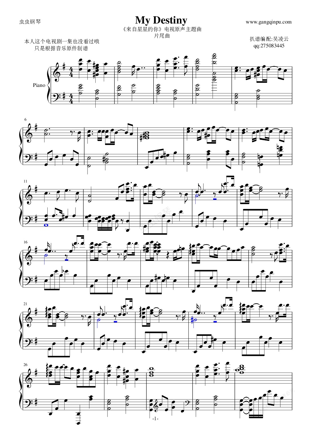 钢琴谱:《来自星星的你》片尾曲 My Destiny