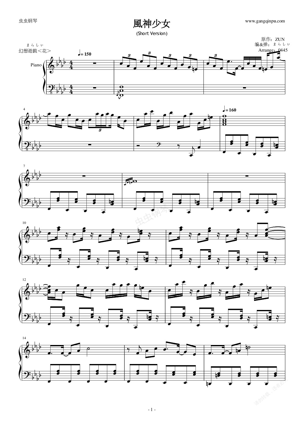 钢琴谱:【东方花映冢】【触手猴】風神少女(Short Version)