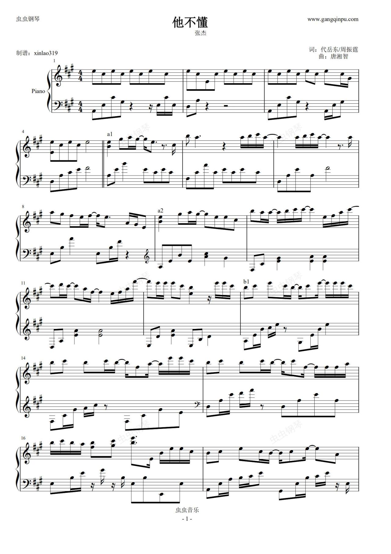 钢琴谱:他不懂-欣仔版-独奏谱