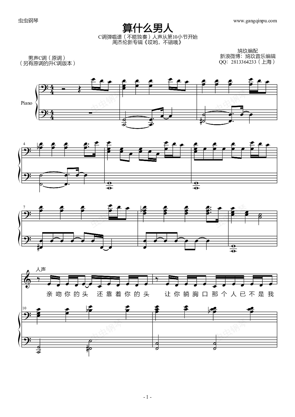 钢琴谱:算什么男人(鸠玖C调弹唱版)