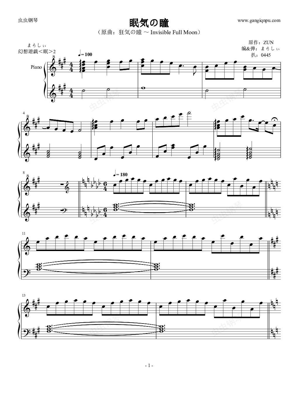 钢琴谱:【东方】【触手猴】眠気の瞳