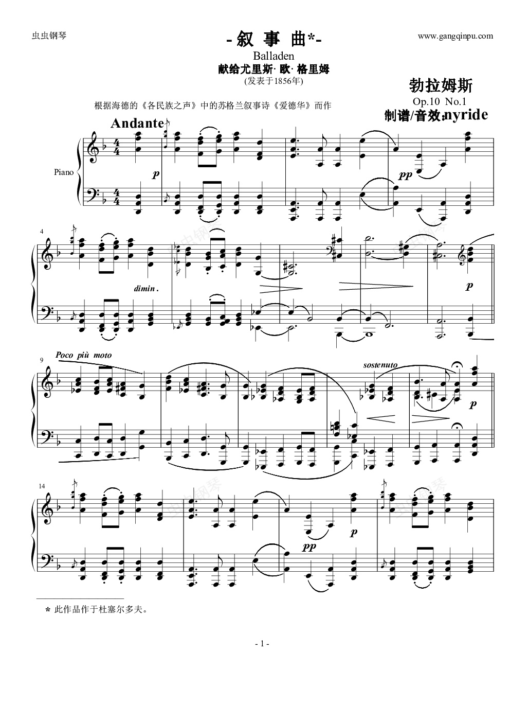 钢琴谱:勃拉姆斯《四首叙事曲》之一