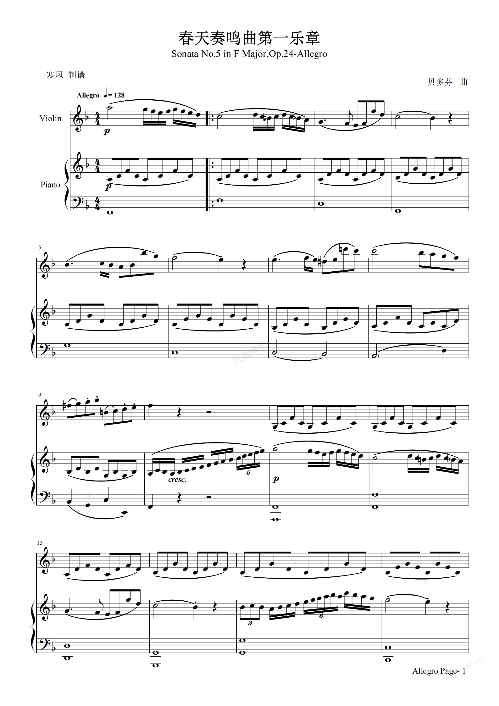 钢琴谱:贝多芬第五小提琴钢琴奏鸣曲“春天”(Op.24)第一乐章