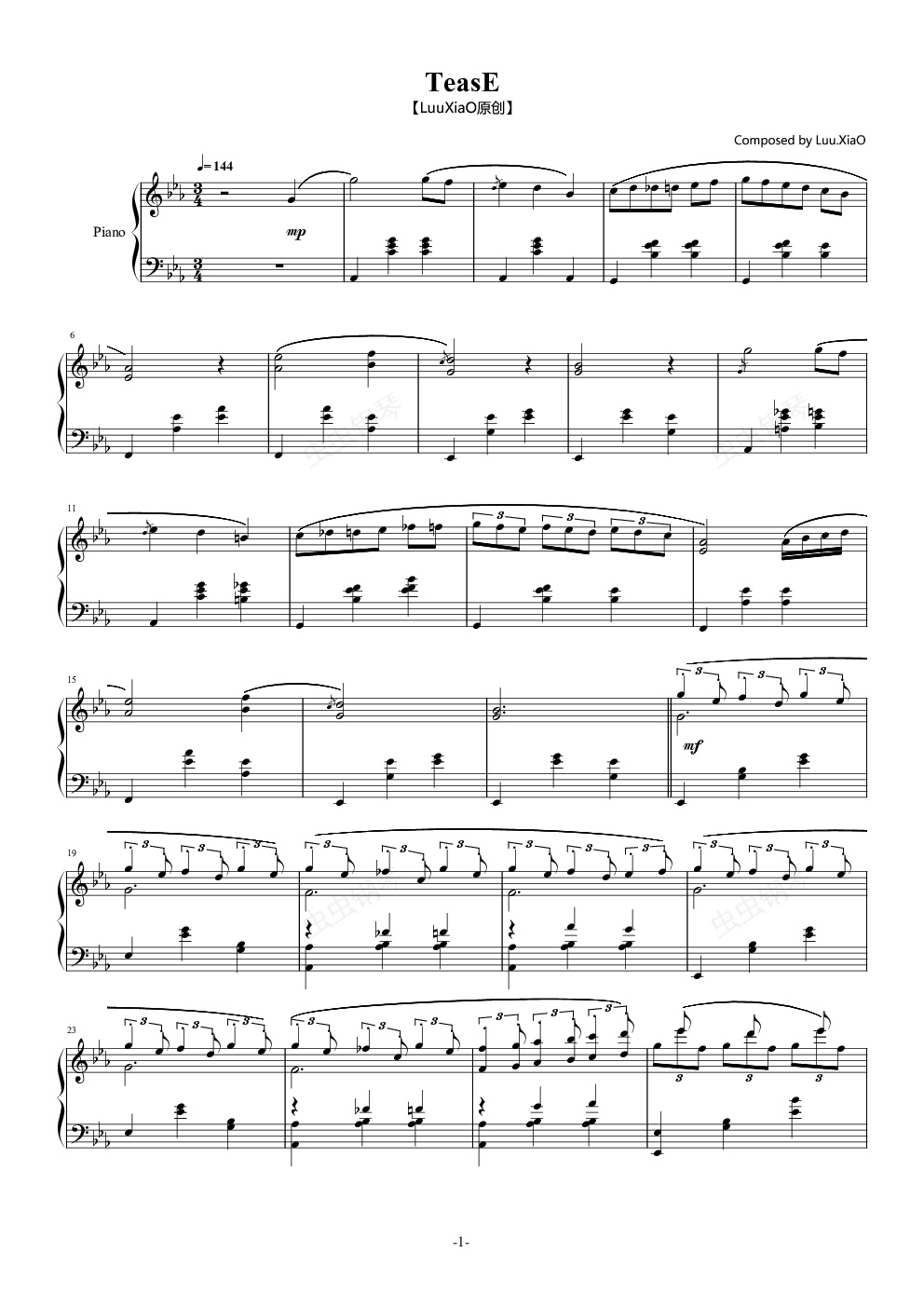 原来一直十分敬佩能写原创曲的人,好吧我现在也来凑凑热闹。 我没学过作曲,所以我就把平常编配曲子时的脑洞全Pia在一张谱子上,权当瞎J8乱写,所以曲子结尾应该很突兀。 -------------------------------------------------------------------- 如果这首尚能入耳的话,以后也许还会继续写写原创曲吧~ -------------------------------------------------------------------- 钢琴音源 piano 下载地址:/s/1 -------------------------------------------------------------------- 曲子试听:/s/1