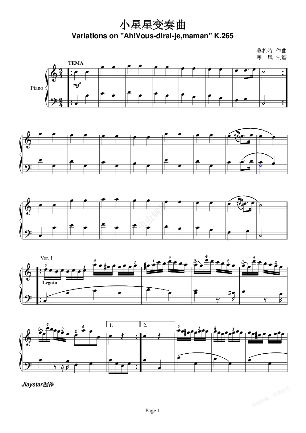 钢琴谱:莫扎特小星星变奏曲K.265(附指法)