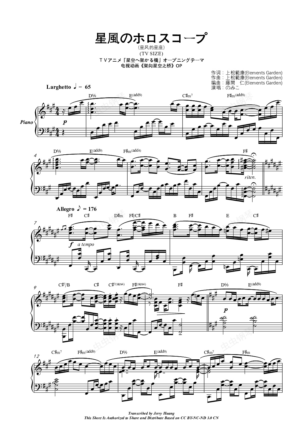 这个...如果管理员看到这段话的话,还希望管理员大大就用我提交的名字就好(没有【】标签怎么看都有点奇怪ORZ)。听了dalao的建议修改了和声和谱面上其他的小错误,重新上传了一遍。这首《星風のホロスコープ》是电视动画《架向星空之桥》OP,动画改编自feng社出品的同名成人游戏。这首OP由隶属于的上松范康作词、作曲,藤间仁编曲,由のみこ演唱。是ACG音乐制作界大佬,主攻游戏配乐,在ACG业界享有盛誉,上松范康和藤间仁的实力不用多说。のみこ()是一位主攻ACG和同人音乐的歌姬,代表作为(自古三面出神曲的典范、东方第四作《东方幻想乡》三面道中曲)《Bad Apple!!》。———————————————————————————————————————————————————————————— 话说回来,虽然说改动画十改九崩可能是一个不争的事实——在改的过程中有把后宫改成百合的(如《苍之彼方的四重奏》),或是重卖肉和玩荤段子轻剧情的(如《夕阳染红的街道》和这部《架向星空之桥》)。但是游戏动画化也不乏优秀的作品(比如《白色相簿》和《缘之空》),这主要看编剧如何把中的多条线中相互补充的剧情用一种合理的方式来呈现;而且动画化也至少能证明一点,就是经过动画化的游戏或是有较出彩的剧情,或是有雄厚的后台,不管如何,这些游戏大多值得一玩,这部《架向星空之桥》也是如此。这部游戏的正宫角色中津川初和《恋爱选举巧克力》中的正宫角色住吉千里是中村绘里子的两个里界代表角色,如果是冲着声优的话就没有不看和不玩的道理(如果你在乎的是中村先生的表界角色的话,建议去看《偶像大师》中的天海春香)。同时,这部作品和另一部作品《夕阳染红的街道》是feng社的两部代表作,对于刚入深坑的新人或是重度妹控的话还是建议体验一下,毕竟这部《夕阳染红的街道》是名声仅次于《缘之空》的妹控神作。———————————————————————————————————————————————————————————— 关于和声:这次我把和弦记号(用神奇的)弄出来了,个人觉得不是很影响识谱,但如果觉得太碍事,可以在下面下载没有和弦记号的版本。话说回来,用和弦记号来修改和声真的是一件很方便的事呢~话说回来,不知道有没有人和我一样觉得开头很有魔性,有一种说不出来的...东方音乐的感觉?原因的话个人估计是因为开头的D6/9,即六九和弦,包含1 3 5 6 2五个音,这五个音稍微变换一下排列方式就是1 2 3 5 6,即大调五声音阶,而且如果有听原曲的话,会发现伴奏声部中有很多五声音阶的下行。这首曲子的和声有几处地方作了变动,纯粹是因为个人觉得这样更顺一些。比如第7小节的第一个和弦,有dalao指出是Bmaj7,但是个人感觉这里放主和弦F#的效果比四级大七和弦Bmaj7效果好一点,所以就(自作主张)保留了F#。7-8小节的其他部分和原曲一致,即C#-D#m-F#/C#,B-F#-E-C#。其中的E是F#小调(A大调)上的借用和弦,是一个很有意思的存在;其中第一个F#/C#(即F#的第二转位)也可以考虑换成F#/A#(即F#的第一转位),效果也是不错的,个人估计作曲时选择F#/C#是因为这样根音正好在前后的根音中间。如果改成F#/A#的话,根音可能会有跳跃,但是因为和前面的C#根音一致,所有会有一点点重复的感觉,而且用F#/A#的话D#m(VI)-F#/A#(I6)-B(IV)的进行也是很顺畅的。———————————————————————————————————————————————————————————— 无和弦记号的版本在这里找:/s/1———————————————————————————————————————————————————————————— [IMG]/pu/2017/6/12/__7776__[/IMG]