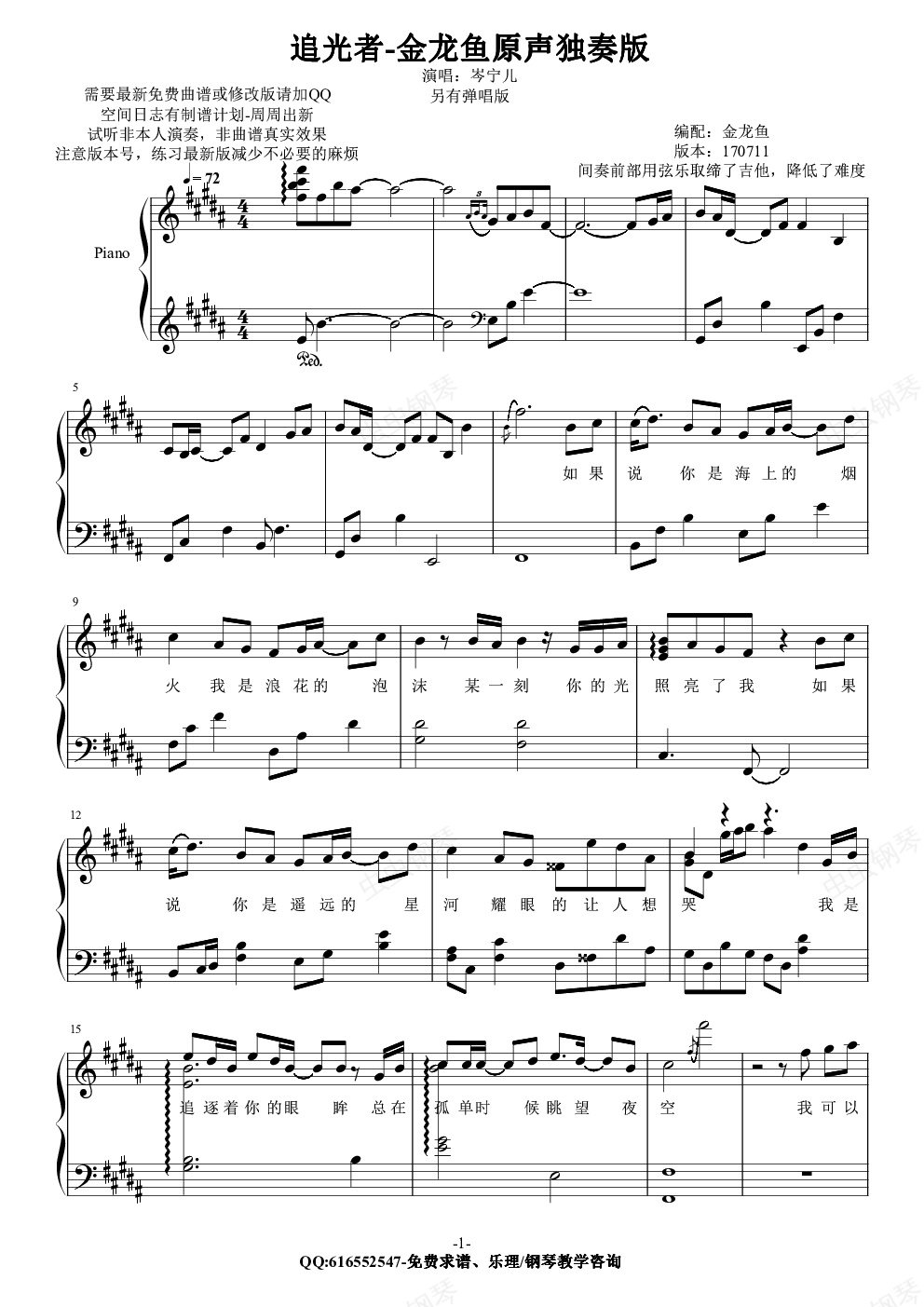 独奏谱-版本说明 特别说明:本人放出的所有钢琴谱均完整上传至曲谱分享网站,并定时更新,不以琴谱做任何牟利(除本人原创音乐以外) 编写曲谱和完整放出的目的是为了同广大琴友学习交流钢琴演奏、音乐理论等问题…… 对此独奏谱有:转调、简化、速成等需求的请加 免费扒谱编配请加QQ,人多需要排队,但不会收费 放出的独奏谱中有本人弹奏时为了方便自己弹奏或者为达到更好个人弹奏效果而做改动, 具体求谱、写谱、谱面等问题的详细说明请参考QQ空间日志 放出为大家分享,金龙鱼所有曲谱(除原创)不用作商业用途,仅供大家弹奏时参考用 固定每周出新 再次特别声明,本人放出只是为了交流学习,觉悟他求!从求谱到制谱发布中间没拿过一分钱,希望别有用心之人看清楚 。。。。。。以后的修改版都会在QQ放出版本修改的具体内容,欢迎大家查阅 设置版本号以及不停的改版给大家的练习带来烦恼,本人对此表示抱歉 但是,人都是在不停学习进步的,随着学习和实践的深入,我对我以前的谱子会有新的想法,以前谱中出现的错误得以在知识丰满后修正,这是对所有人的尊重, 希望大家谅解,这么做的目的也是源于本人放谱的目的:为了学习交流,为了促使自己的进步