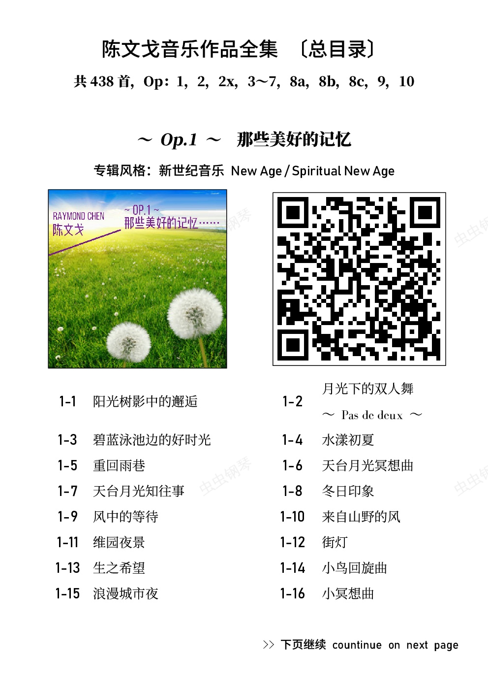 谨此授权虾米音乐网()、网易云音乐()永久收录保存此《陈文戈音乐作品全集》音响资料,并授权虫虫钢琴()永久收录保存此《陈文戈音乐作品全集》乐谱资料,共曲目肆佰叁拾捌(438)首、贰拾(20)张专辑,拾叁(13)个Op号(1,2,2x,3,4,5,6,7,8a,8b,8c,9,10)。本资源内所有作品,可在 4.0 BY协议下共享和传播。特此授权。 陈文戈 2018年8月
