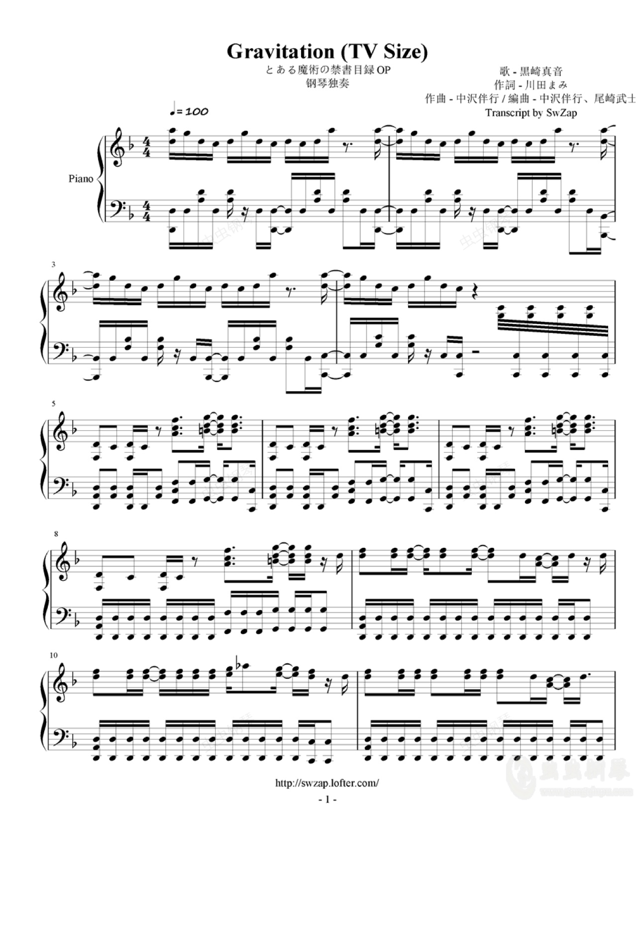 钢琴谱:【魔法禁书目录 III OP】Gravitation (TV Size)