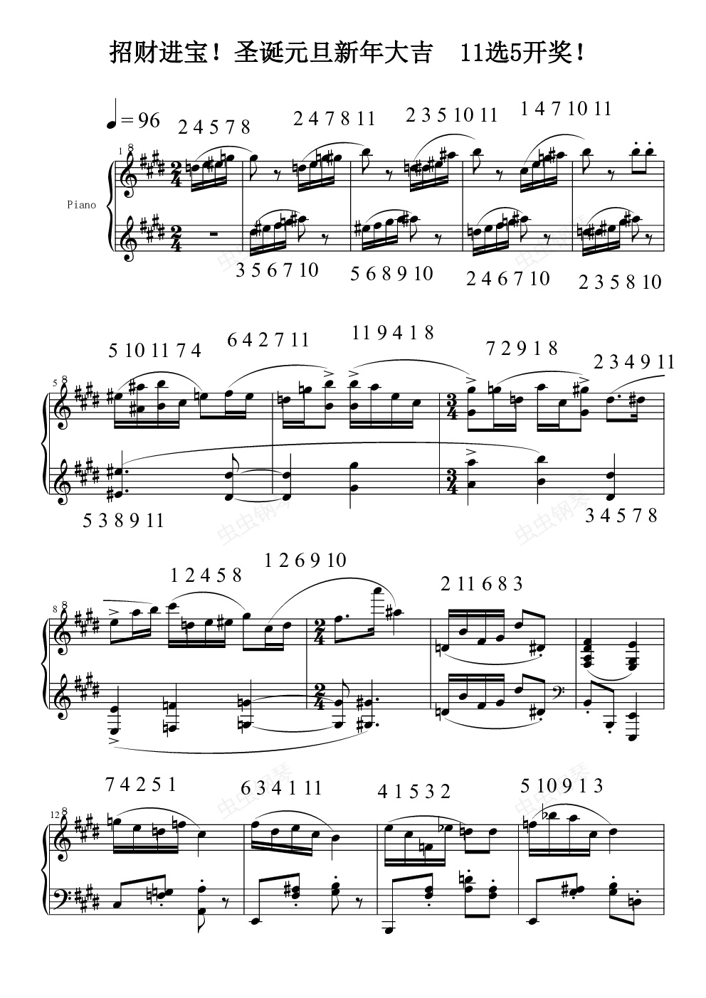 音高材料来源:2018年12月21日广东省体彩11选5第17-52期开奖号码,如图所示。[IMG]/pu/2018/12/22/__9771__[/IMG]号码1~11对应 升C/降D ~ B音。由于开出号码没有0,因此没有C音。为什么选择E大调?因为巧合,4 8 11几个号码出现的比较多。