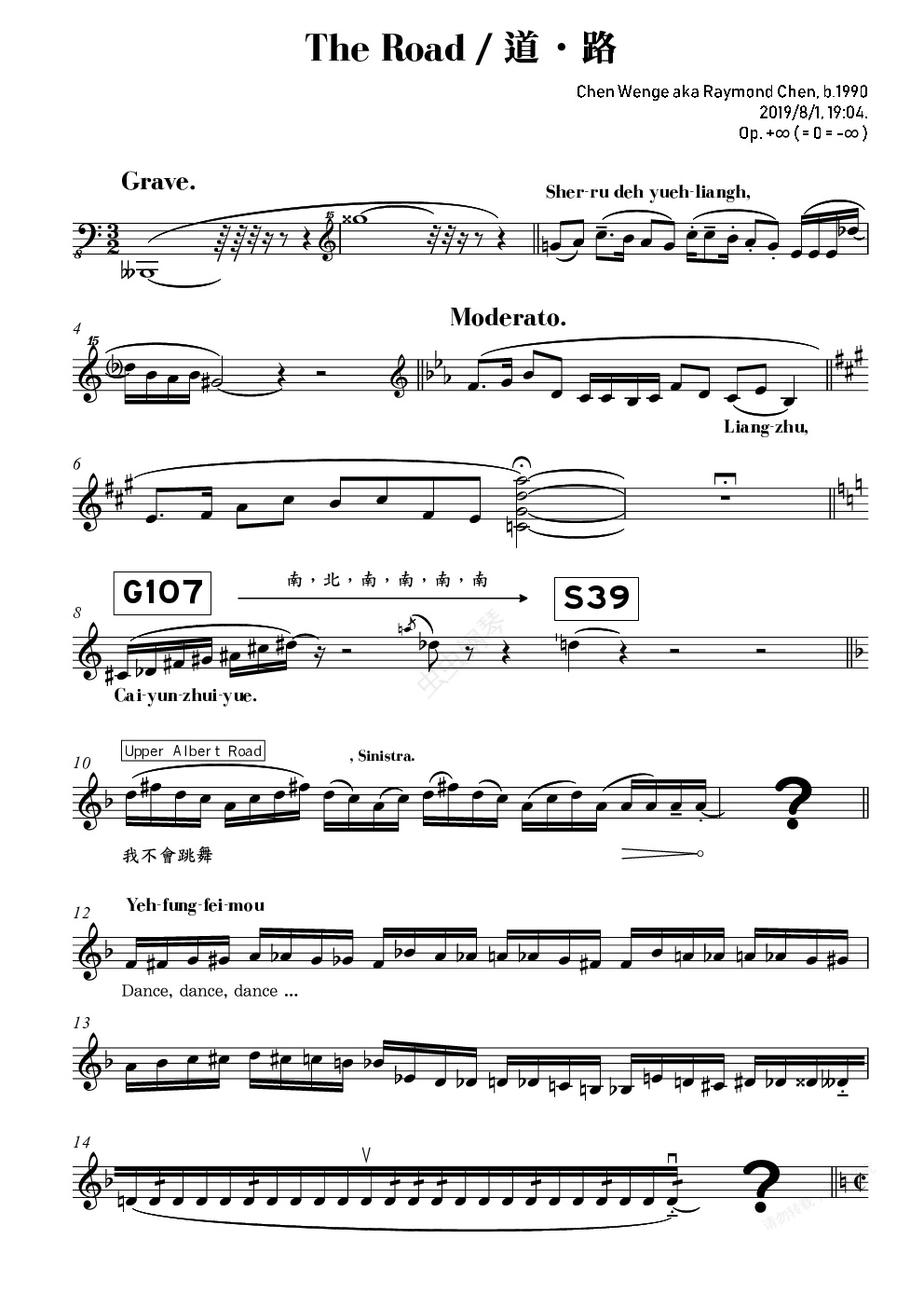 陈文戈(1990-)新作:《遥·控》(Op. -∞)和《道·路》(Op. +∞),为“所有乐器”而作,作于2019年。这两部作品中不仅有音符、力度、表情、和弦标记、演奏法等,而且还包括了门牌号、车牌号、飞机场的简称、方向经纬度名词、各种语言字符、各种箭头、电脑程序语言等,以隐喻的方式试图表示世间万象的运作方式,揭示“阴阳”、“矛盾和抵消”的真谛。Chen Wenge’s new art music (Op. -∞, 2019) and The Road (Op. +∞, 2019), for "" --- In these two, such as notes,, chord, etc. are with such as room, names, world, song names and,, texts in,, and even --- to imply the way how the world works (i.e. what, yin and yang, etc. had).