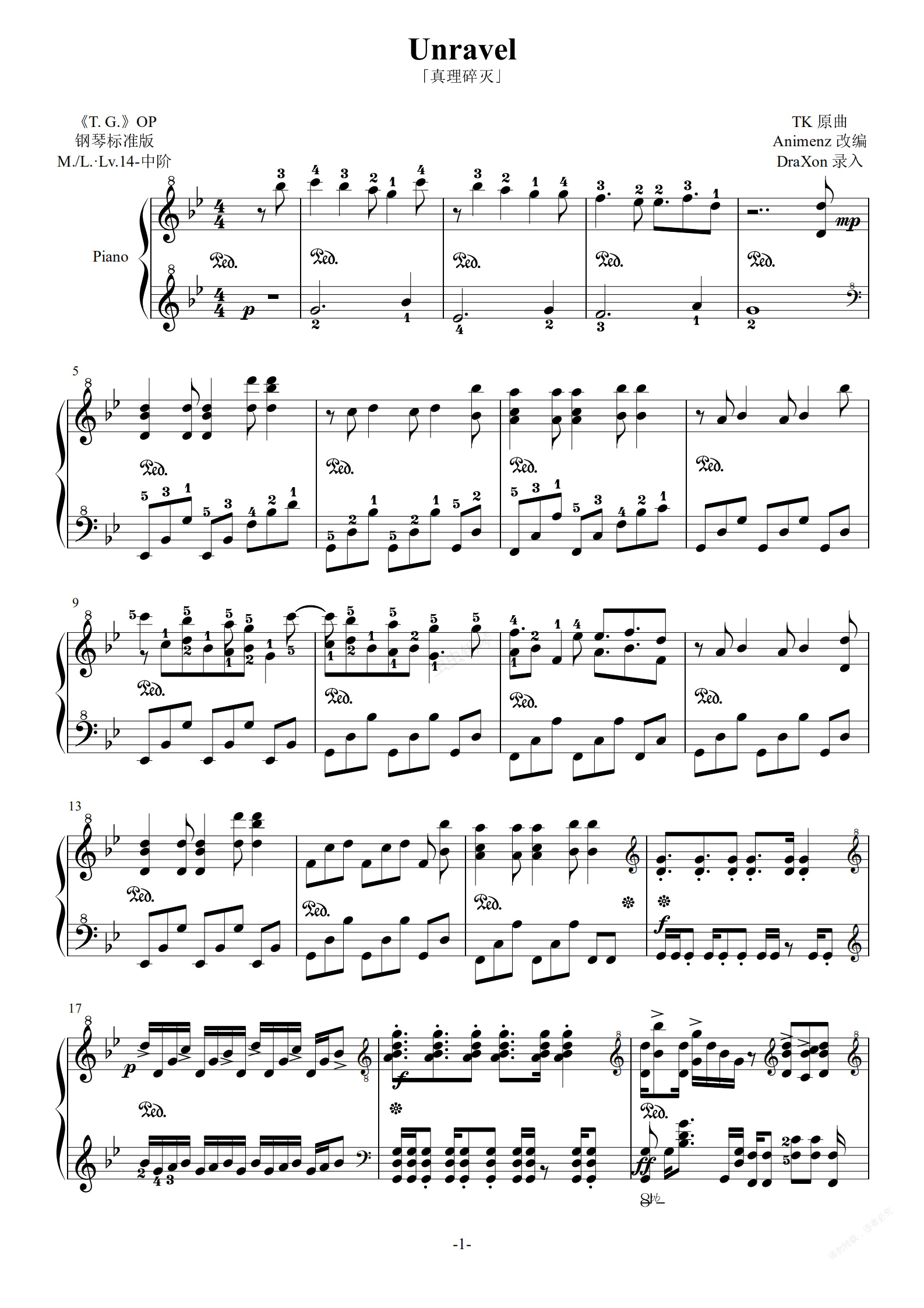 钢琴谱:Unravel(东京喰种OP,带指法完全版 by DraXon)