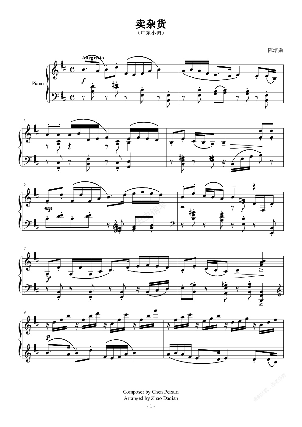 1952年作曲家陈培勋根据广东小调创作的《卖杂货》,目前已被列为七级钢琴曲,并由本人改编。《卖杂货》也是其中一首优秀的钢琴作品,是作者根据广东音乐和广东小调创作的系列钢琴曲的第一首。复三部曲式,第一部分欢快流畅的旋律取材于同名广东小调的加花谱。抒情徐缓,清新幽雅的中间部分,作者选用小调《梳妆台》写成,与前后两个部分既形成对比,又自然融洽。全曲很好地保持了广东小调的独特地方特色,又将主调、对位有机地运用在钢琴的演奏上,还能够充分发挥钢琴这一乐器的演奏效果,是一首很好的具有中国风味的钢琴作品。