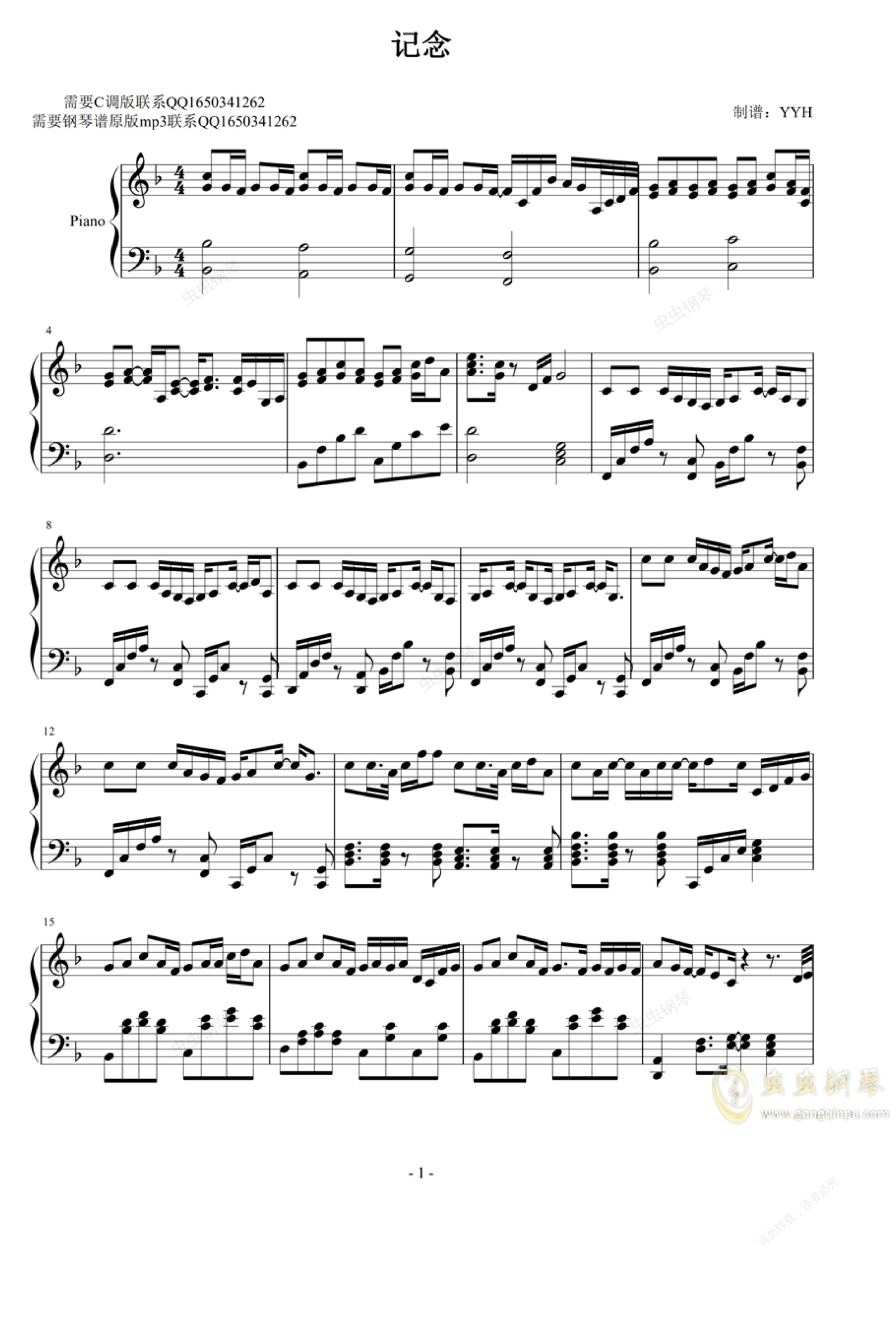 这首雷雨心的《记念》十分好听,但网上这首歌的钢琴谱或是残缺,或非原调,或不和谐弹起来双手配合不方便。于是便制作出完整版原调,包括原曲的节奏型都认真分析过仔细扒下来,不想让这首好听的歌没有一份像样的谱子。另外这首歌有两个调,发行的是F大调,当初雷雨心在中国好声音现场唱的是升F大调,所以需要升F调和C调版本的可以联系我QQ。
