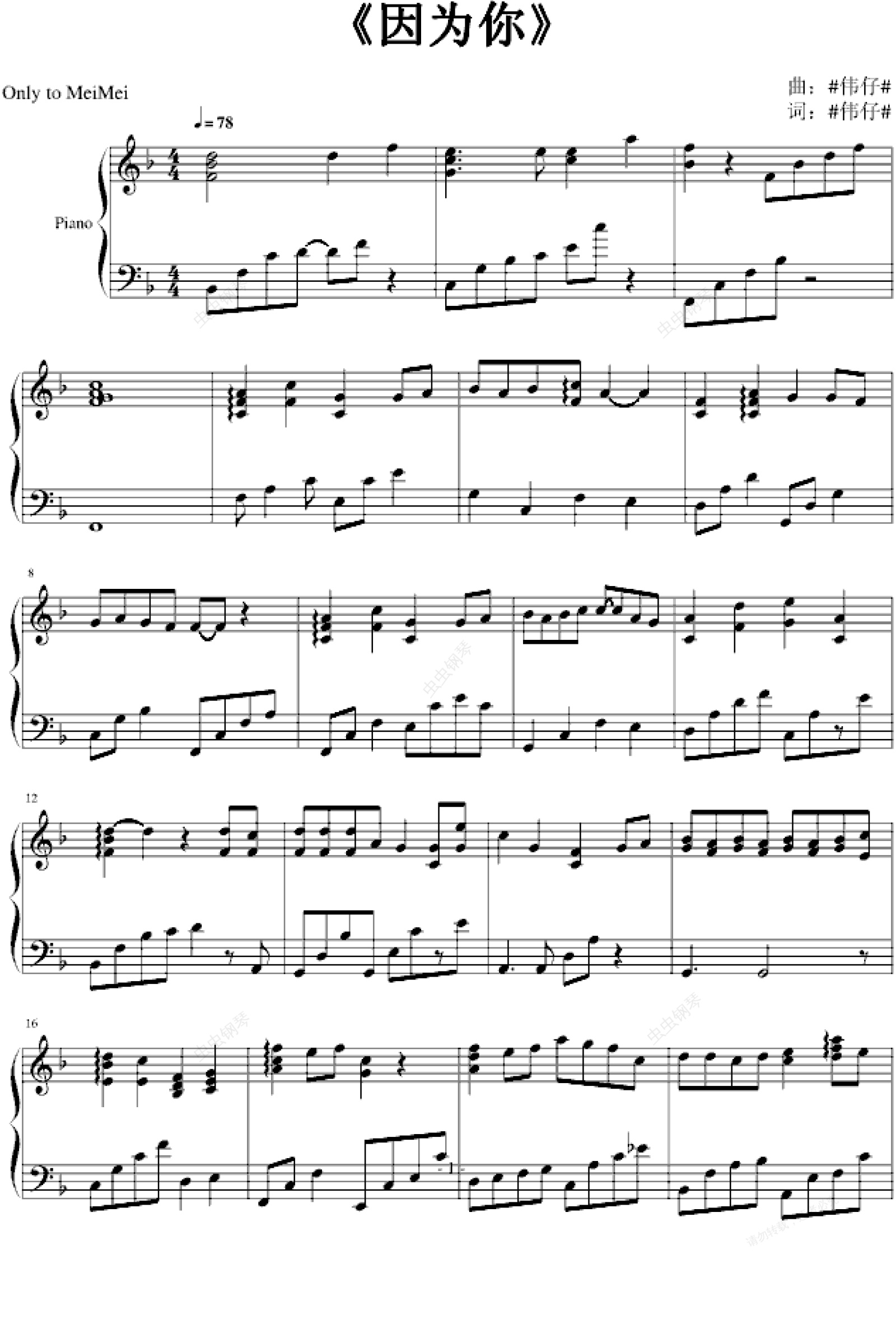 钢琴谱:因为你