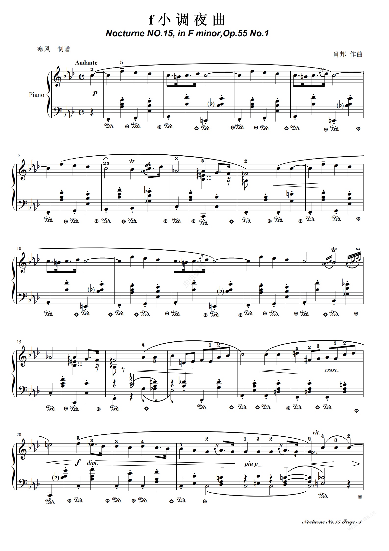 钢琴谱:肖邦夜曲15-f小调夜曲(Op.55-1)
