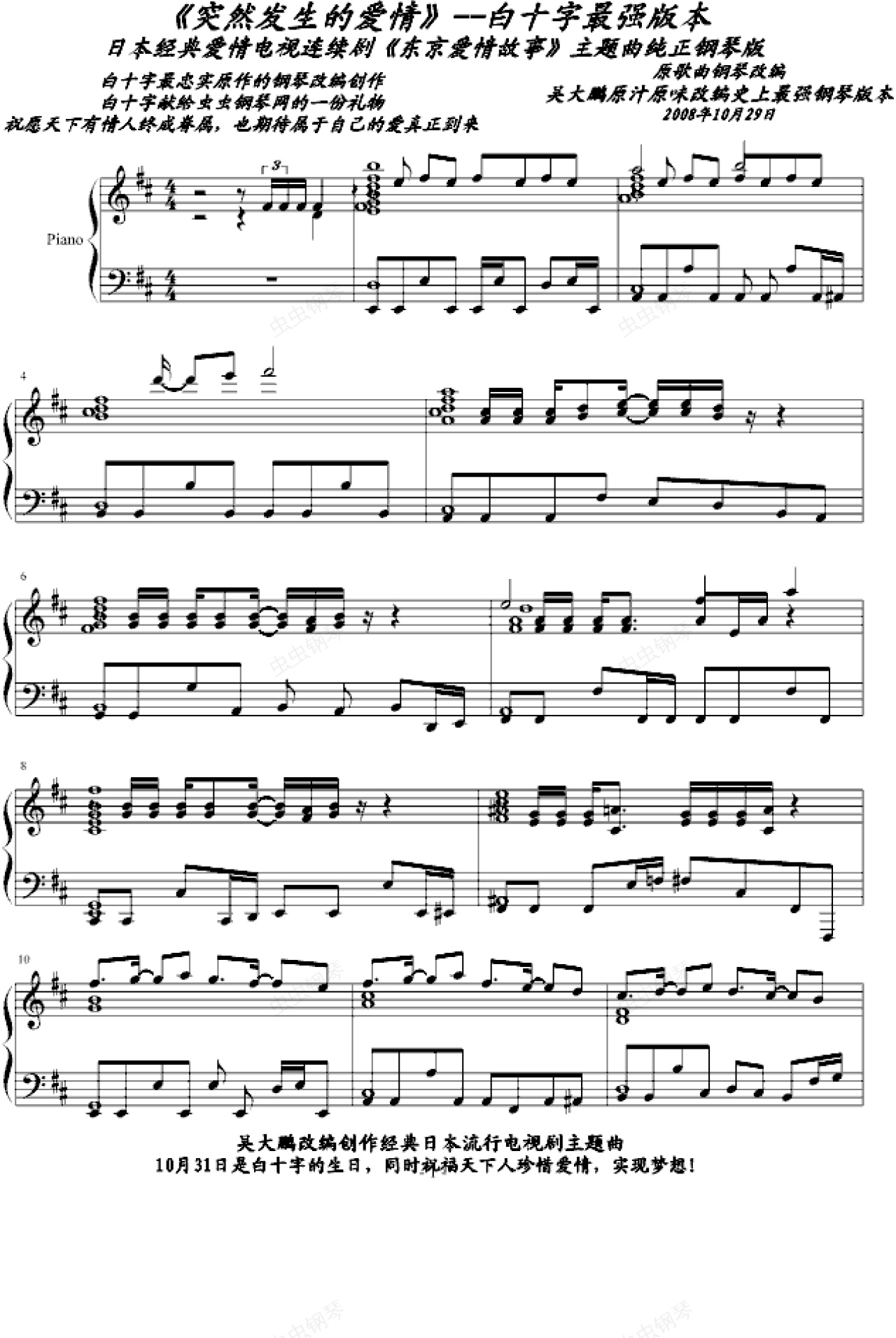 相信很多人找《东京爱情故事》的主题曲钢琴谱都只有一个而已,我以前也在找,但是让我失望的是,那个并不是原汁原味钢琴版本,时隔若干年,前天,有朋友突然出贴在虫虫钢琴里面,希望获取真正的原汁原味曲,我就花点时间弄个新的版本